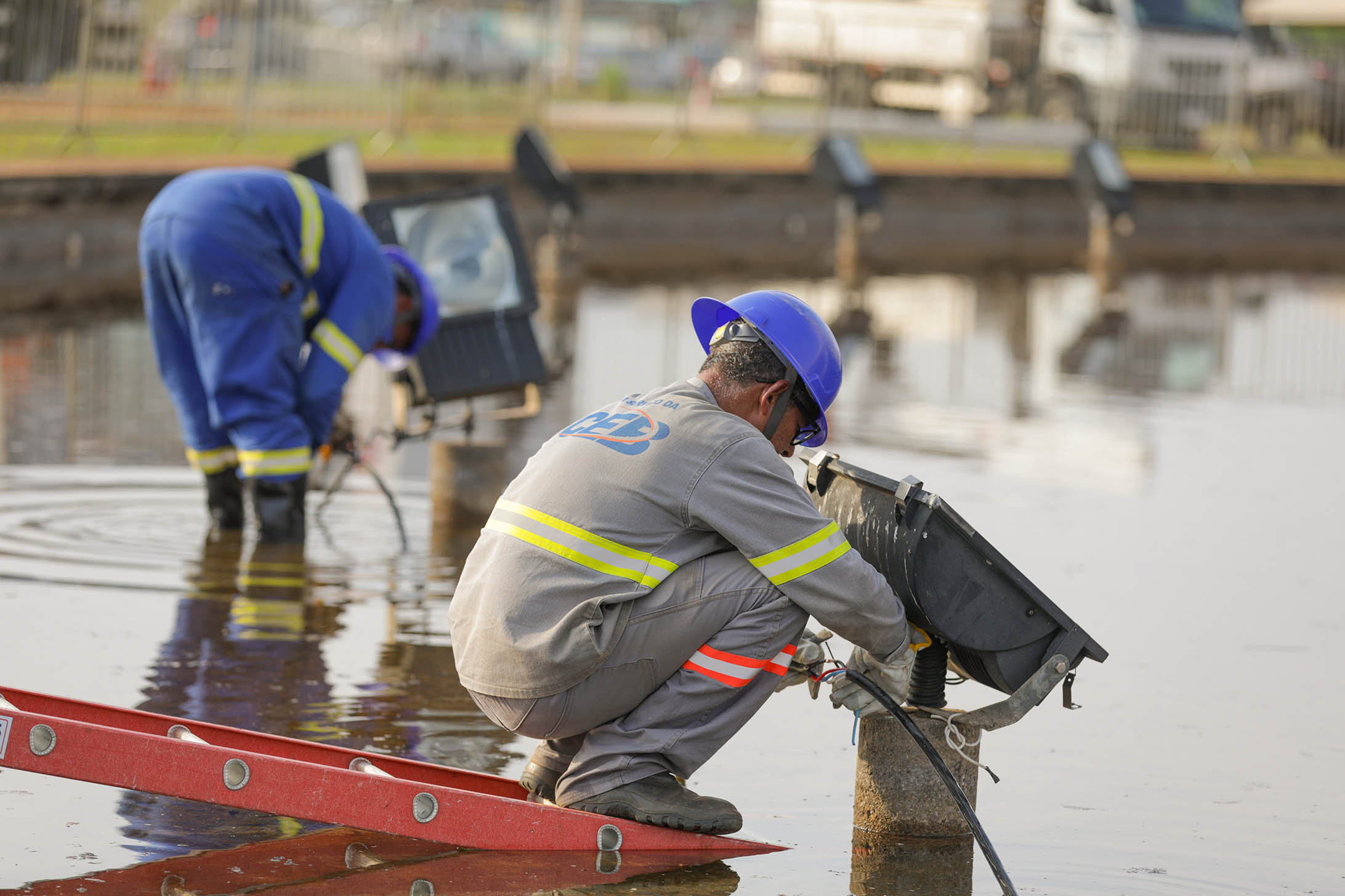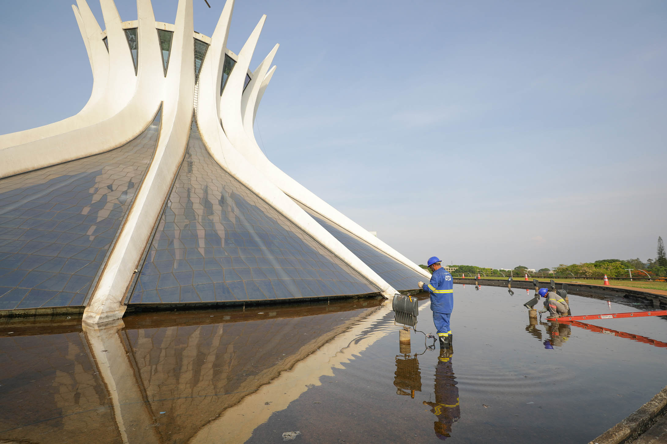 Antes da instalação dos novos cabos, ocorreu a limpeza do espelho d’água. O trabalho uniu esforços do programa GDF Presente e da Companhia de Urbanização da Nova Capital (Novacap). Foram utilizados cinco caminhões pipa, sendo que cada um comporta entre 15 mil e 20 mil litros de água.