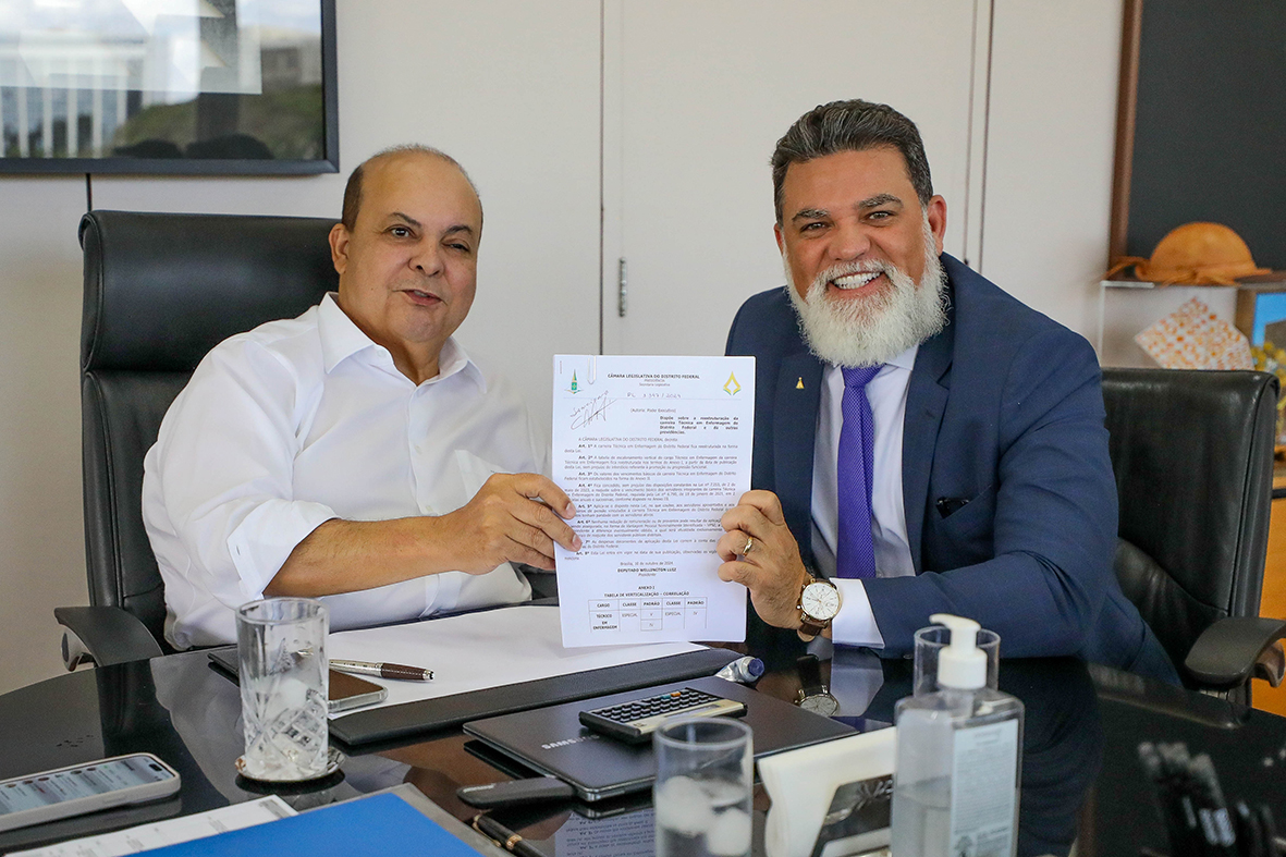 O governador Ibaneis Rocha assinou nesta terça-feira (22) a lei que autoriza o reajuste salarial dos profissionais da carreira de técnico em enfermagem da Secretaria de Saúde do Distrito Federal. A assinatura ocorreu no gabinete do chefe do Executivo e foi acompanhada pelo secretário-chefe da Casa Civil, Gustavo Rocha, pelo secretário de Comunicação, Weligton Moraes e pelo deputado distrital e servidor da carreira da Saúde Jorge Vianna.