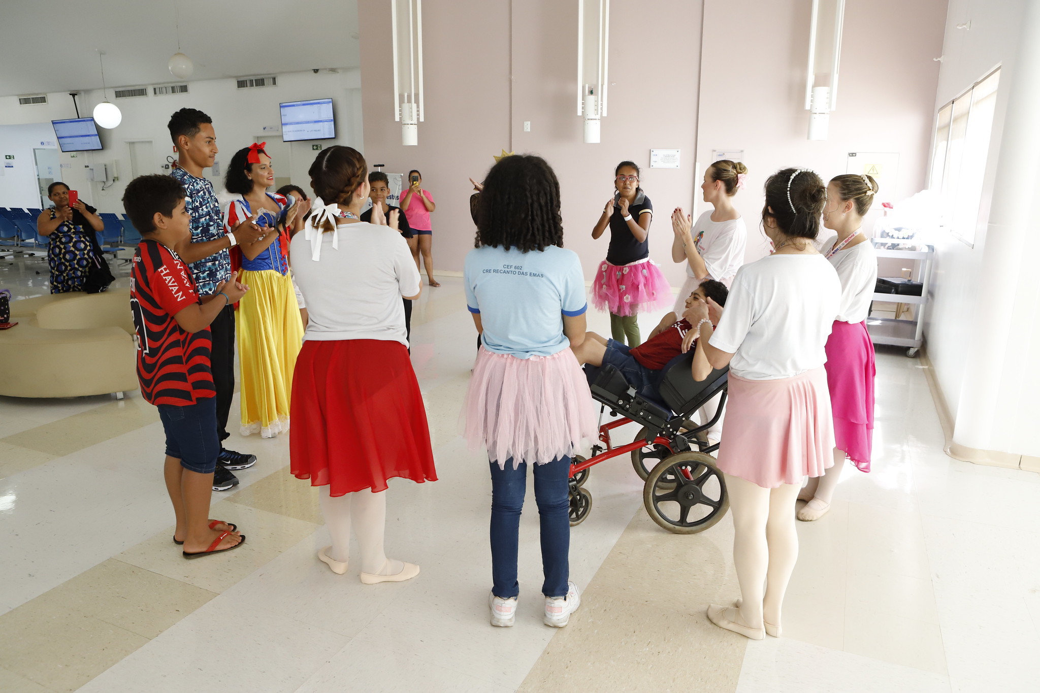 “Na ponta do pé. Agora um plié. Muito bem! Dá uma voltinha”. Meninas e meninos mantêm os olhos focados nos comandos das professoras de balé. O cenário, porém, não é um estúdio ou uma academia, mas os corredores do Hospital da Criança de Brasília José de Alencar (HCB). Por um instante, os pacientes mirins focam em algo leve e lúdico.