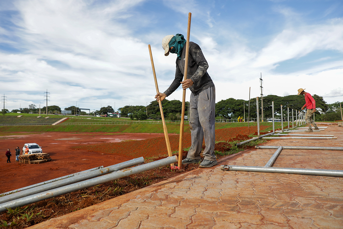 Enquanto a bacia de detenção aguarda o fim das obras do sistema do Drenar DF, o maior programa de captação e escoamento de águas pluviais, operários instalam 600 metros lineares de gradis de proteção ao redor da estrutura.