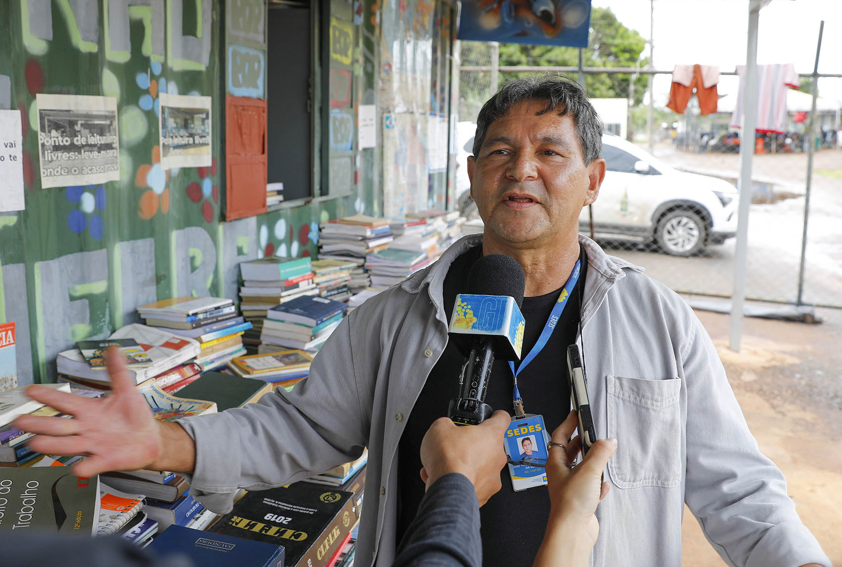 “Neste momento eu estou fazendo uma viagem no tempo, mas sem sair do lugar, por meio deste livro”, diz G.P., de 49 anos, ao folhear as páginas de Olha Para O Céu, Frederico!, de José Cândido de Carvalho. Assistido pelo Centro de Referência Especializado para População em Situação de Rua (Centro Pop), localizado na Quadra 903 da Asa Sul, ele é frequentador assíduo da biblioteca do espaço.