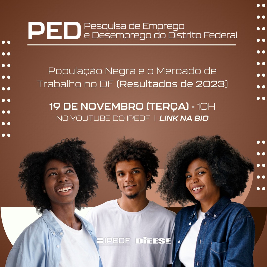Em alusão ao Dia Nacional da Consciência Negra, o Instituto de Pesquisa e Estatística do Distrito Federal (IPEDF) e o Departamento Intersindical de Estatística e Estudos Socioeconômicos (Dieese) apresentarão, nesta terça (19), os resultados do boletim anual População Negra e o Mercado de Trabalho no DF.