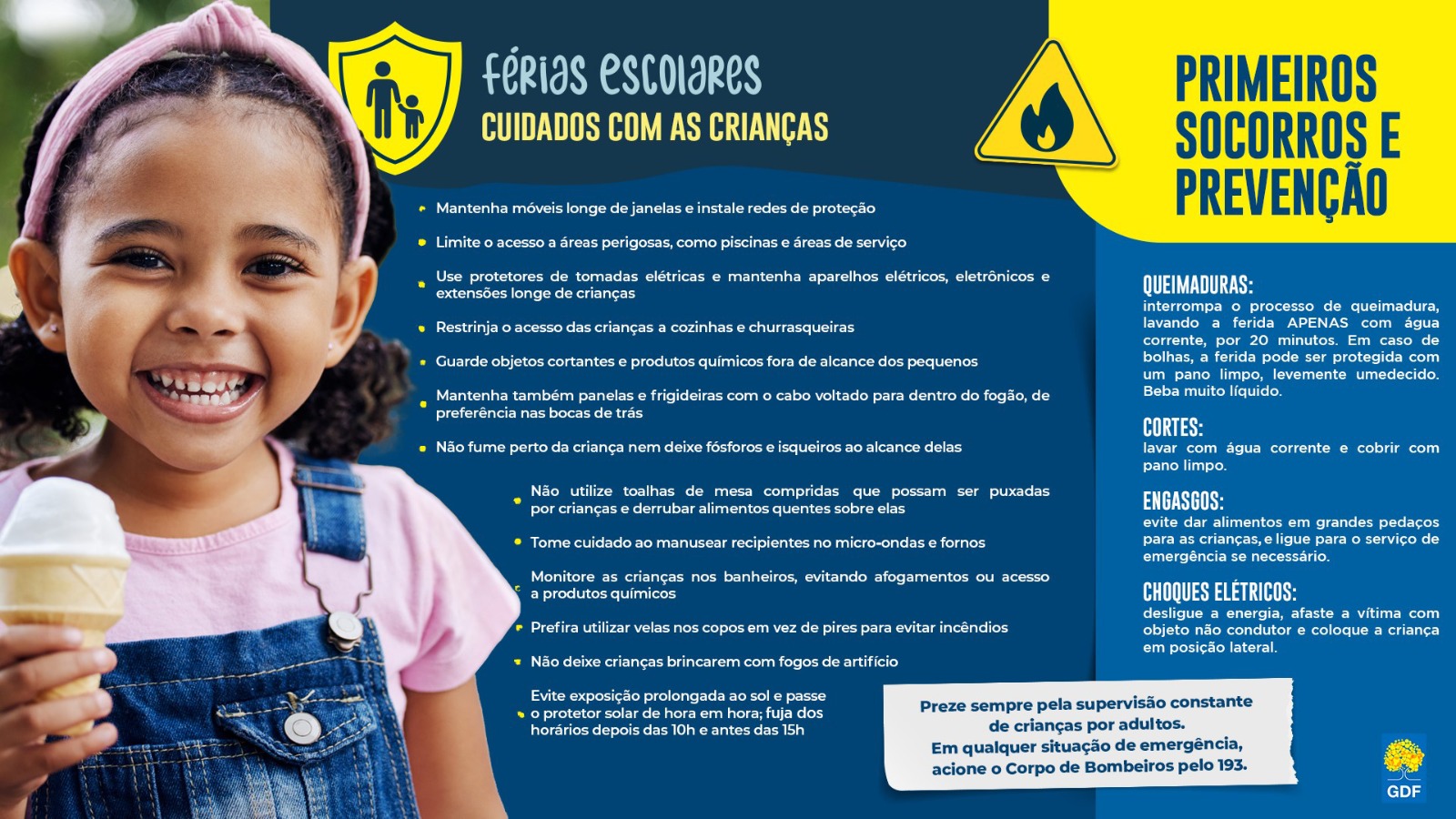 “Primeiro deve-se lembrar aos pais que, como é uma época previsível, é importante ter uma programação – colônia de férias e coisas assim – para que criança gaste a energia acumulada e não tente coisas perigosas”, exemplifica o major Bohle, do CBMDF.