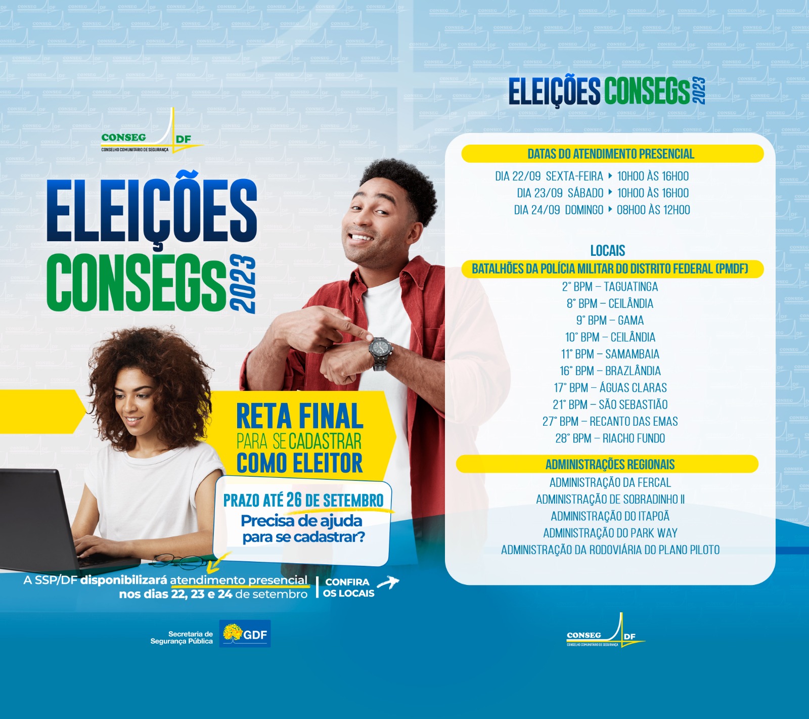 O prazo para cadastro de eleitores no processo eleitoral dos Conselhos Comunitários de Segurança do Distrito Federal (Consegs-DF) termina na terça-feira da semana que vem, dia 26. O cadastro deve ser feito no site da Secretaria de Segurança Pública (SSP-DF). O processo é rápido, mas é preciso ter em mãos título de eleitor, documento oficial com foto e comprovante de residência, que devem ser anexados no sistema.