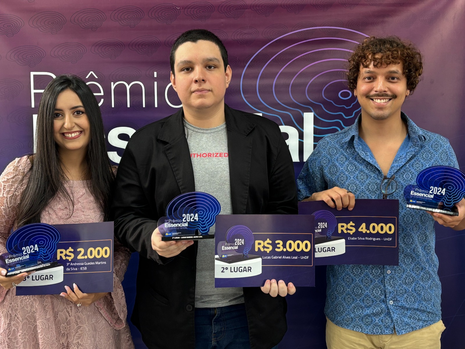 Estudantes vencedores do 3º Prêmio Essencial de Controle Social: Andressa Silva, do Iesb (3º lugar); Lucas Leal, da UnDF (2º lugar) e Eliabe Rodrigues, também da UnDF (1º lugar) | Foto: Divulgação/CGDF