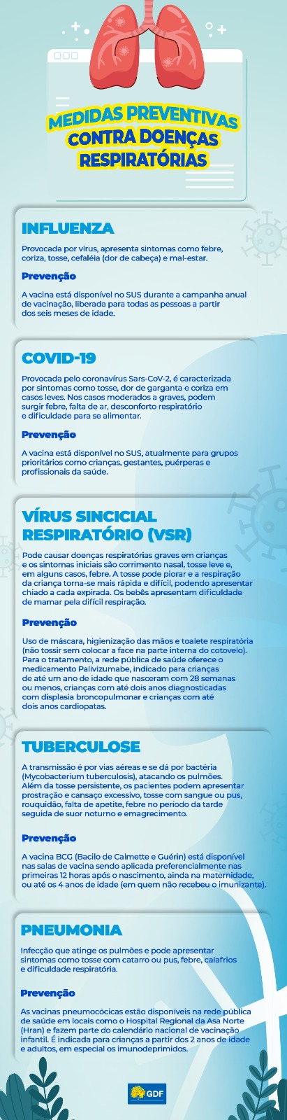 De acordo com a pneumologista do Hospital Regional da Asa Norte (Hran) Gilda Elizabeth , este é o momento de caprichar na ingestão de líquidos, frutas e procurar uma alimentação mais leve, além de umidificar o ambiente. “Com o tempo mais seco, as crianças, idosos e pessoas com doenças respiratórias crônicas sofrem mais pela dificuldade de respiração”, explica a médica. Ela também chama atenção para a ferramenta de combate mais importante para a prevenção de quadros mais graves: a imunização.