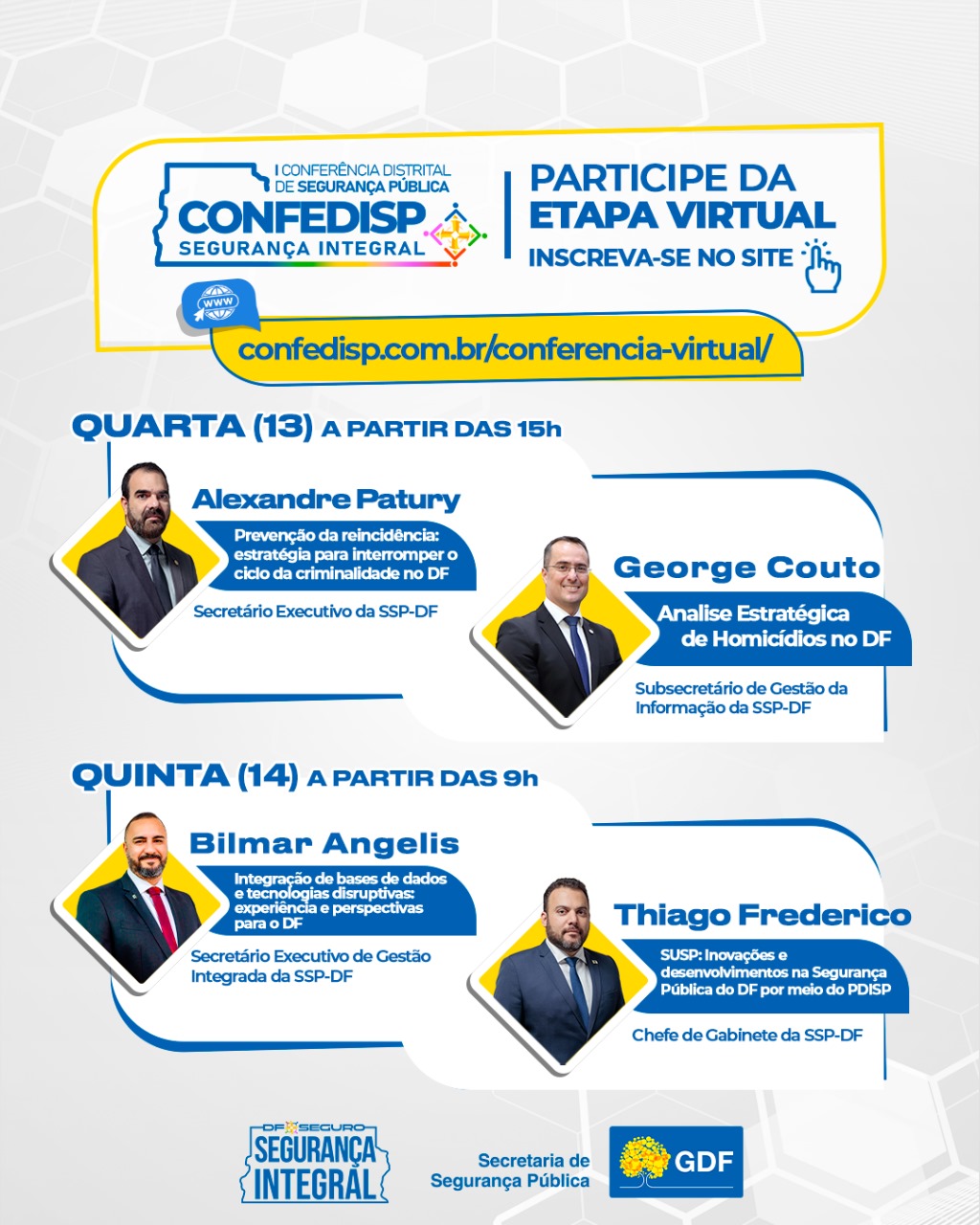 O secretário-executivo da SSP-DF, Alexandre Patury e o subsecretário de Gestão da Informação da SSP-DF, George Couto são os palestrantes previstos para esta quarta (13). Na quinta (14), palestram o secretário Executivo de Gestão Integrada, Bilmar Angelis e o chefe de Gabinete da SSP-DF, Thiago Frederico.