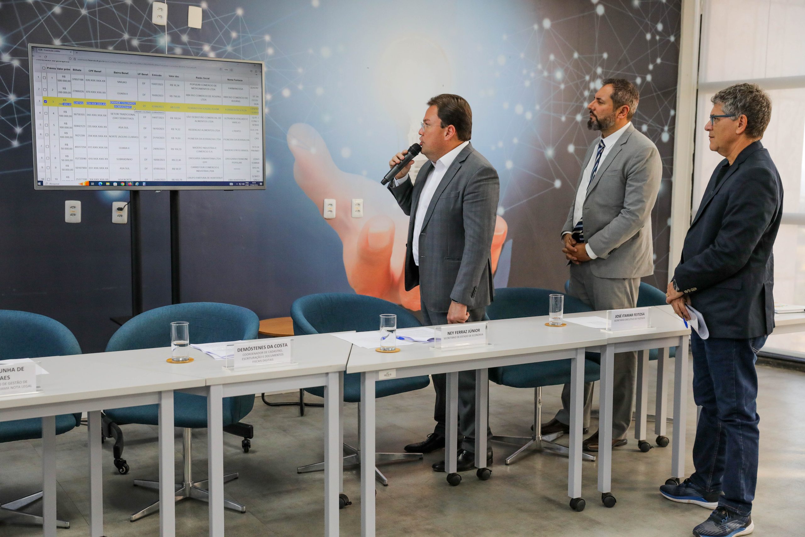 “O mais importante é que todos podem ganhar. A pessoa fez uma compra de somente R$ 16 e acabou de ser premiada com um valor de meio milhão de reais”, destacou o secretário de Economia, Ney Ferraz (à esquerda) | Foto: Paulo H. Carvalho/Agência Brasília