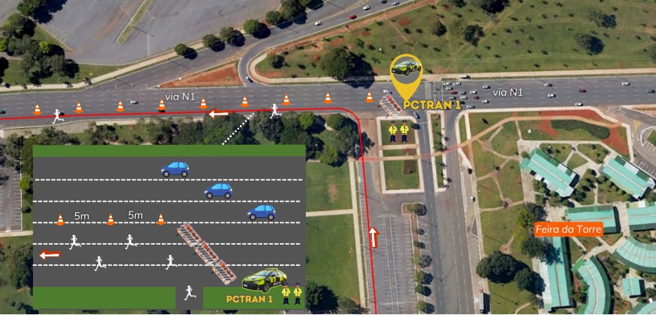 A partir das 6h30, na via S1, no trecho entre a Praça do Cruzeiro e a Torre de TV, as três faixas próximas ao canteiro central serão bloqueadas para o tráfego de veículos, sendo destinadas aos participantes do evento.