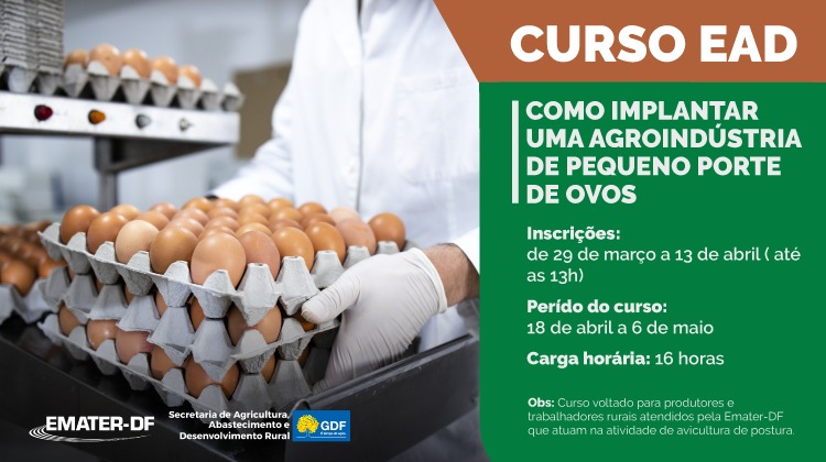 A Emater-DF está com inscrições abertas para o curso Como Implantar uma Agroindústria de Pequeno Porte de Ovos. A capacitação é totalmente online, e as matrículas ficarão disponíveis até o próximo dia 13.