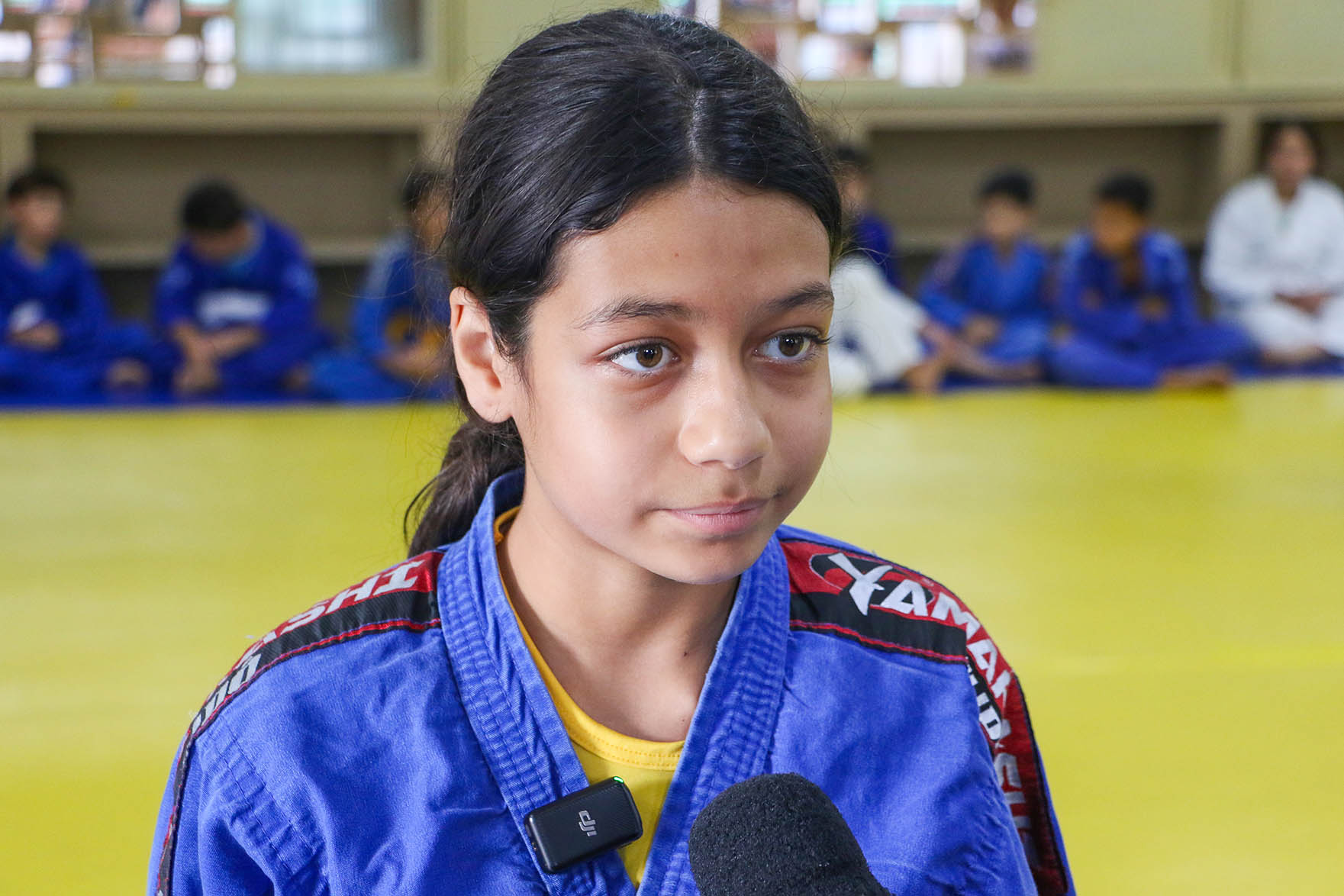 “Estou muito orgulhosa do mestre. Ele ensina a gente a estudar e ter disciplina e também fala para termos respeito com os outros”, diz a aluna Maria Cecília Braz Marcelino