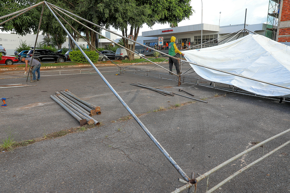 Pela manhã, no estacionamento da UBS 1 do Guará, a empresa contratada pelo GDF deu início à montagem das estruturas metálicas que servirão como base para as tendas. Os toldos de revestimento também foram instalados. Eles darão a proteção necessária aos pacientes e profissionais de saúde que utilizarão esses espaços.