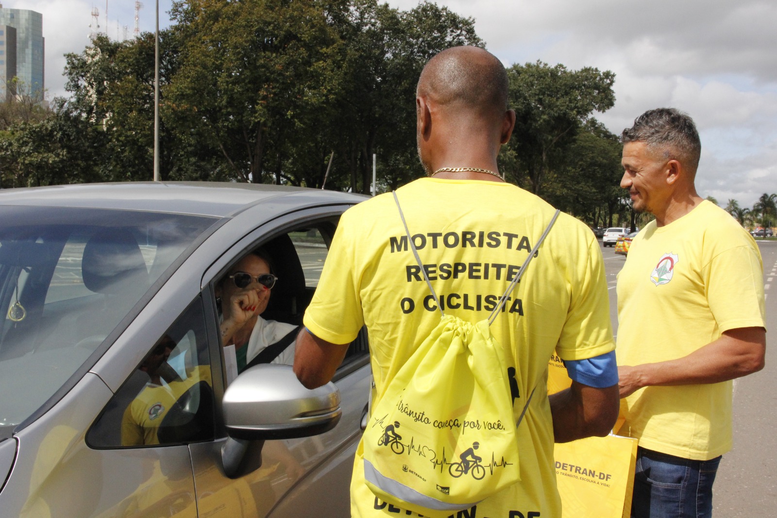 Durante a ação, os educadores do Detran-DF conversaram com motoristas e ciclistas e entregaram material educativo. Os ciclistas do grupo Japa da Bike também participaram do evento reforçando a importância da conscientização.