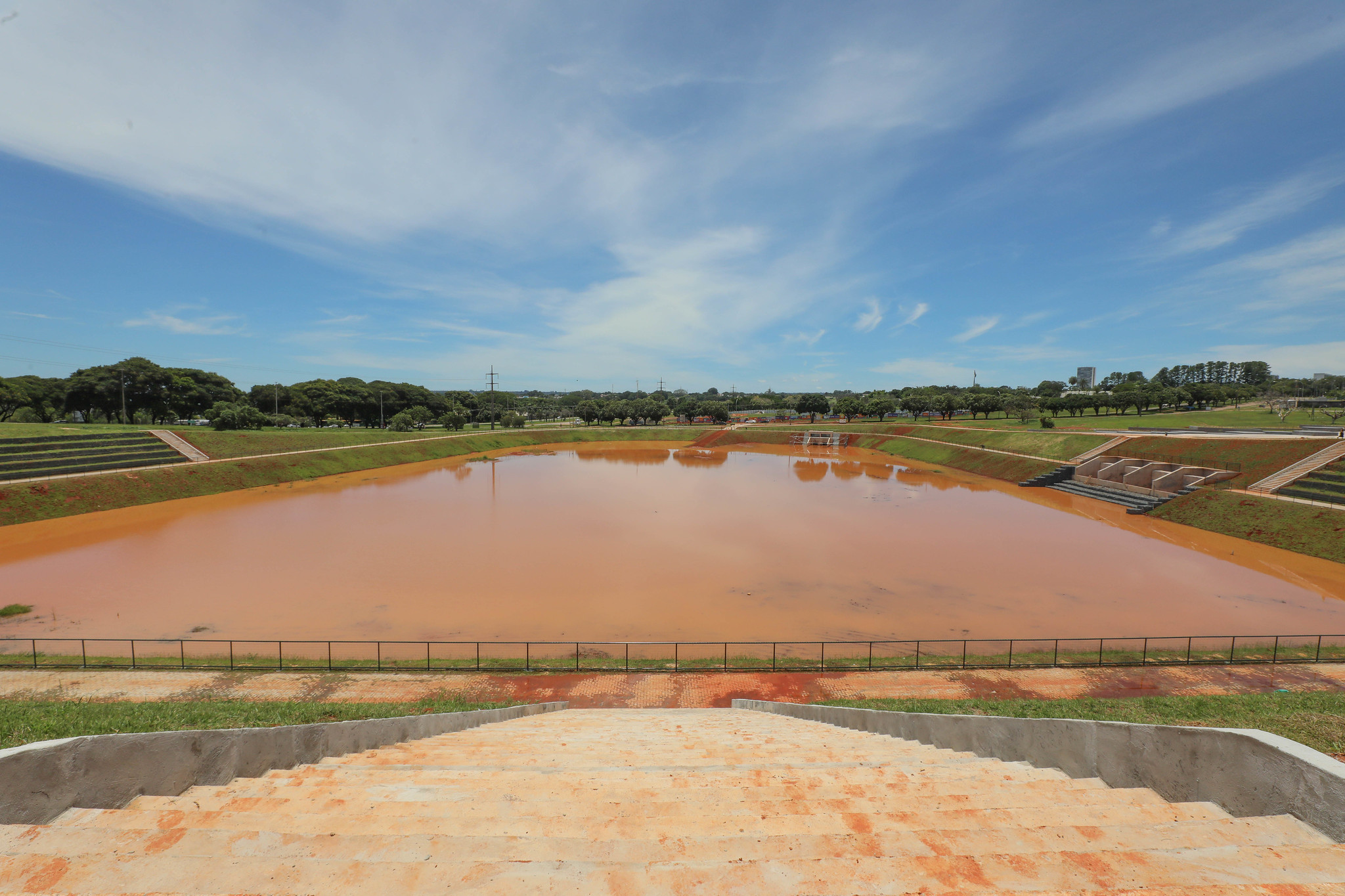 Iniciado após a escavação do reservatório, o trabalho incluiu etapas como a execução de jardineira e bancos em concreto, instalação de piso em pedras portuguesas, plantio de grama e mudas de árvores e arbustos – sendo a maioria nativa do Cerrado, além da construção do estacionamento com 42 vagas – das quais seis são reservadas para idosos e pessoas com deficiência -, de 1,1 km de ciclovia ao redor da bacia e de cerca de 1,6 mil m² de calçadas, que seguem as normas vigentes de acessibilidade. Também foram fixadas oito lixeiras e 12 paraciclos.