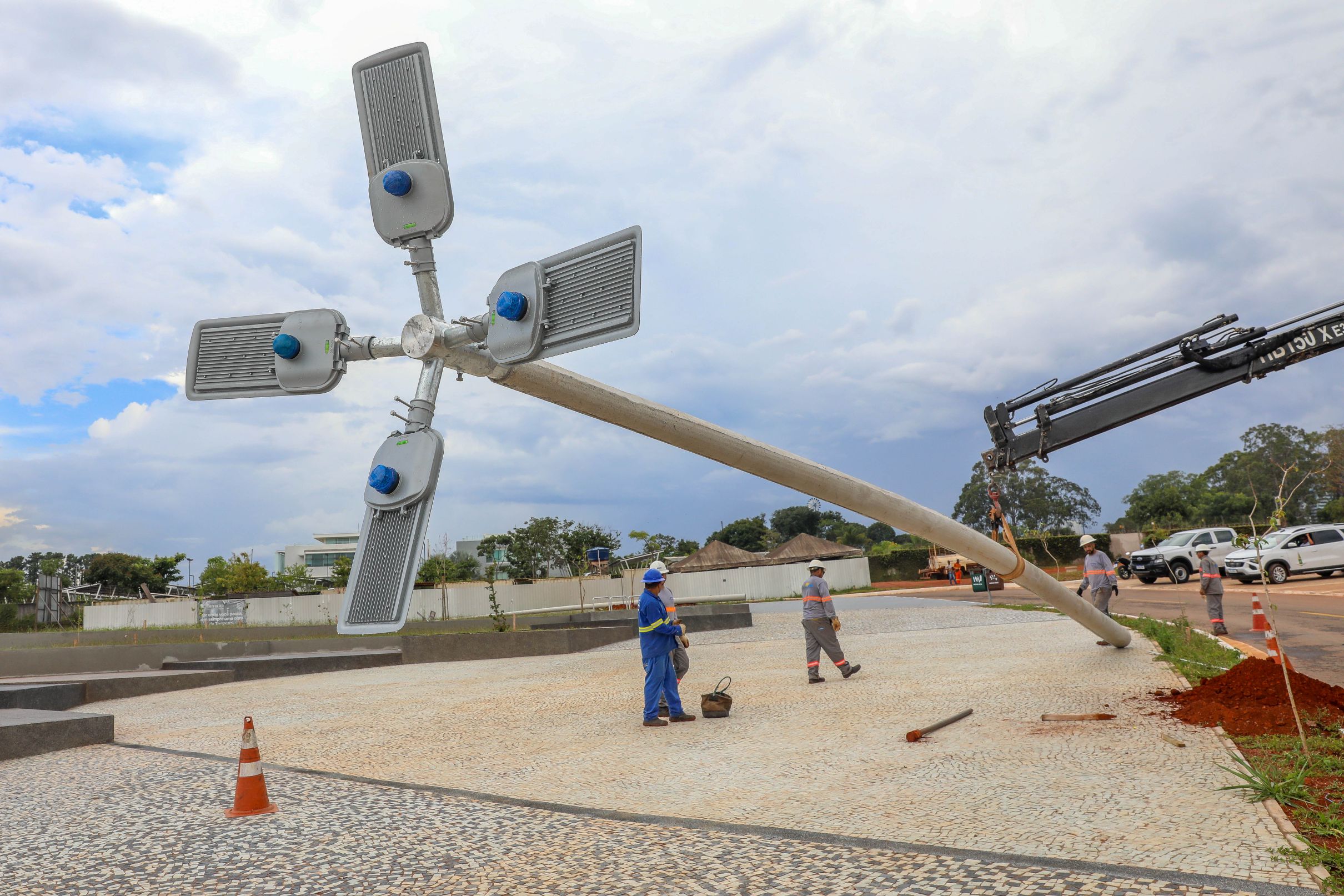 Nove postes foram instalados na Praça Internacional da Paz, construída no Setor de Embaixadas Norte ao lado da bacia de detenção do Drenar DF. “Este é mais um importante projeto que a gestão do governador Ibaneis Rocha entrega para a população de Brasília”, diz o presidente da CEB Ipes, Edison Garcia | Fotos: Joel Rodrigues/Agência Brasília