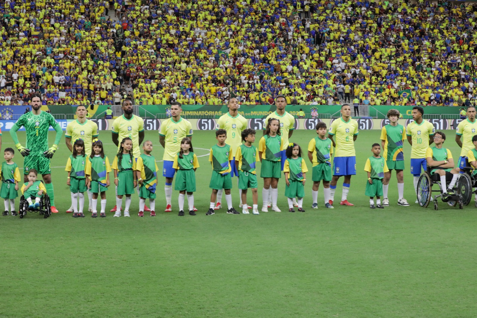 Heróis brasileiros entraram em campo na noite desta quinta-feira (20) na Arena BRB Mané Garrincha. E não estamos falando dos jogadores da Seleção Brasileira Masculina de Futebol que enfrentaram a Colômbia em partida das Eliminatórias da Copa do Mundo de 2026. O timaço que roubou a cena no gramado nesta noite foi a Seleção de Guerreiros do HCB, composta por 30 pacientes em tratamento de câncer ou de doenças raras no Hospital da Criança de Brasília (HCB). Carregando as bandeiras ou ao lado dos jogadores das duas seleções, os pequenos deram um show de alegria, emocionando todos os presentes.
