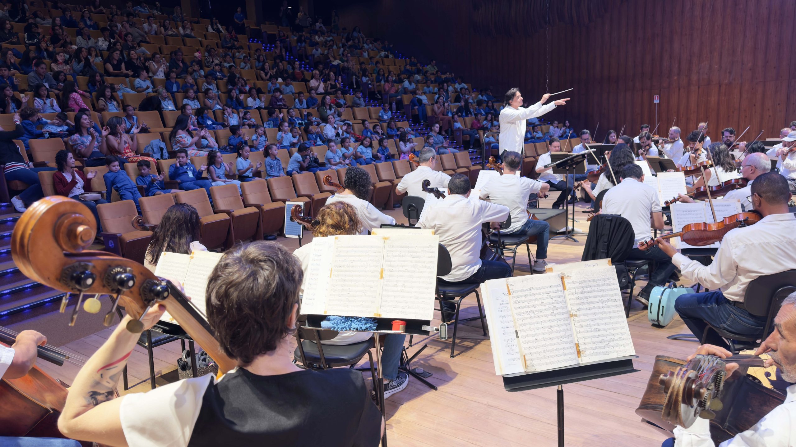 Musicalização e aprendizagem marcaram a manhã de cerca de 400 estudantes de escolas públicas de Brazlândia, Ceilândia, Taguatinga, Guará e Sobradinho nesta quinta-feira (6). Eles tiveram a oportunidade de mergulhar no universo da música clássica ao assistir a um concerto didático da Orquestra Sinfônica do Teatro Nacional Cláudio Santoro, sob a regência do maestro Cláudio Cohen. A apresentação foi realizada na Sala Martins Pena, reinaugurada em dezembro de 2024.