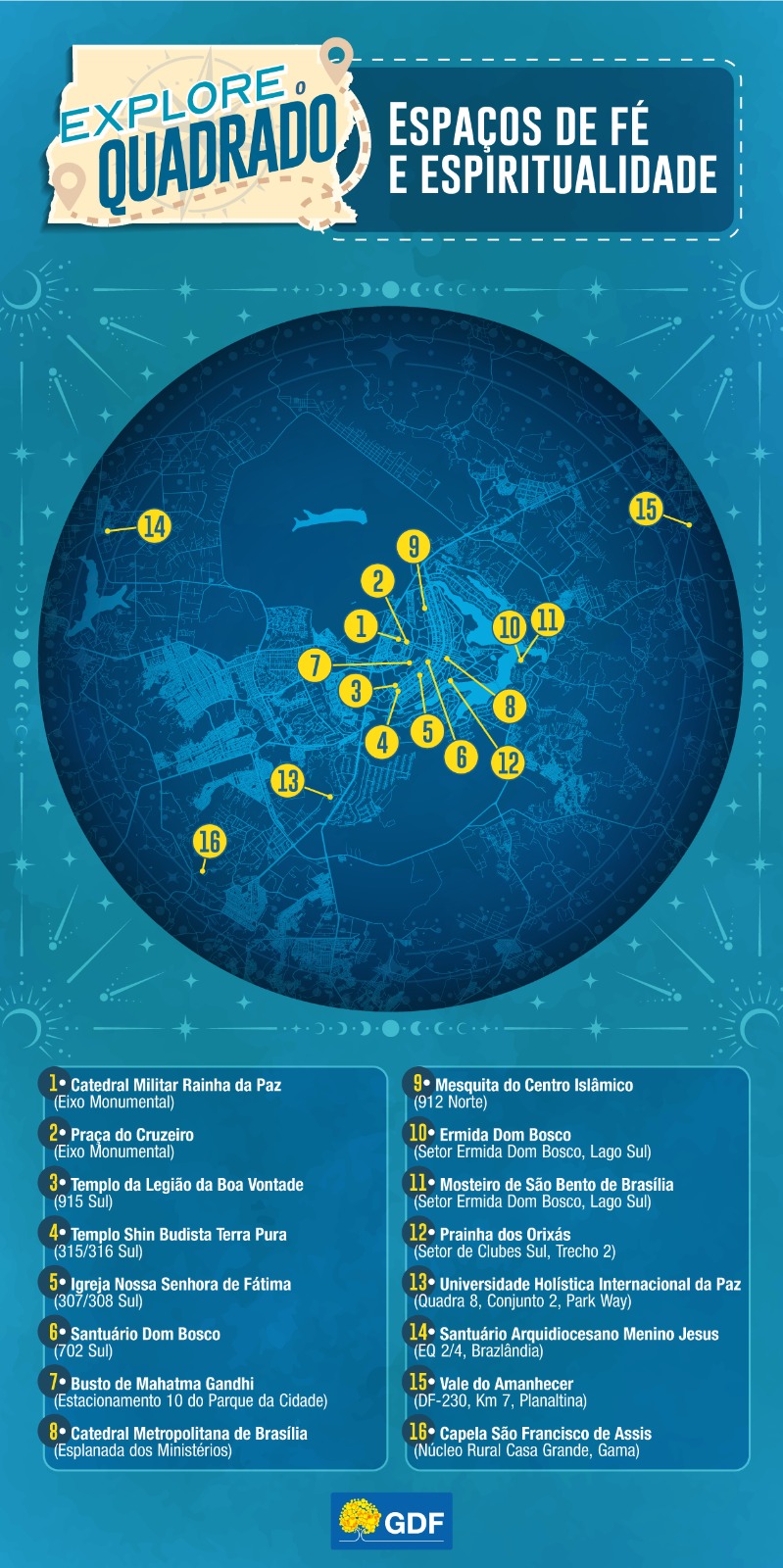 Do sonho de Dom Bosco ao traçado em formato de cruz do Plano Piloto, Brasília tem vocação para a espiritualidade. Por todo o Distrito Federal, estão espalhados diversos templos de diferentes religiões e espaços ecumênicos para quem quer um encontro com a fé. Seja para buscar um momento de paz, seja para admirar a arquitetura ou outras particularidades, as férias escolares são uma boa oportunidade de conhecê-los ou revisitá-los. Por isso, como parte da série Explore o Quadrado, a Agência Brasília apresenta a seguir alguns desses locais.