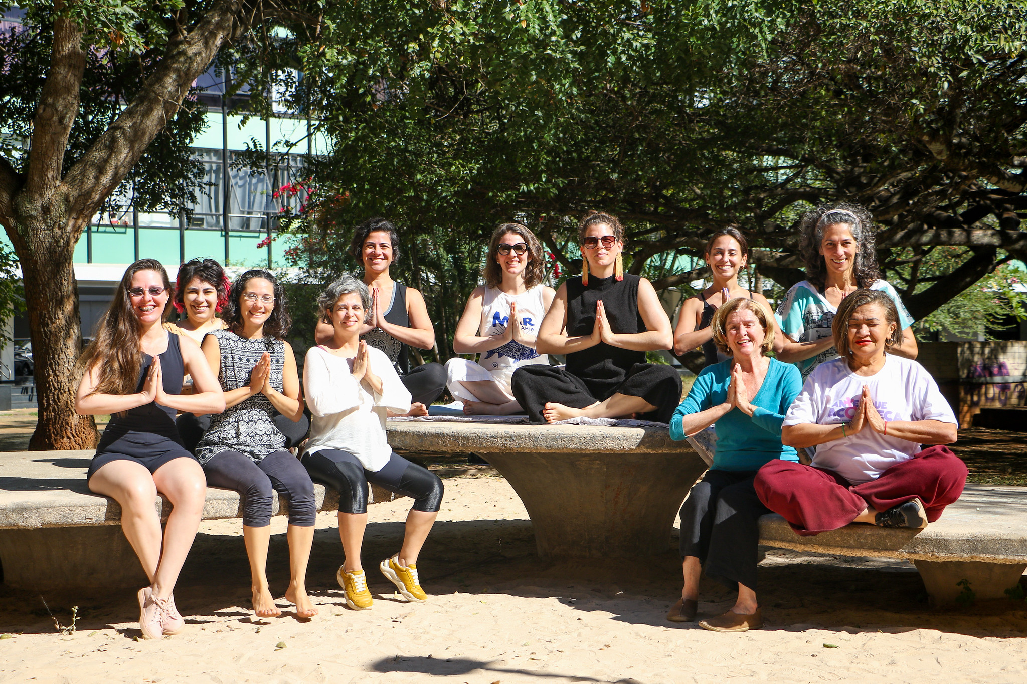 A professora Dais Rocha (quinta a partir da esquerda, na fila de trás) faz yoga perto de casa: “É muito legal resgatar o princípio inicial do projeto de Brasília, essa questão da quadra modelo ser uma cidade saudável e um ambiente que favorece o convívio” | Foto: Matheus H. Souza /Agência Brasília