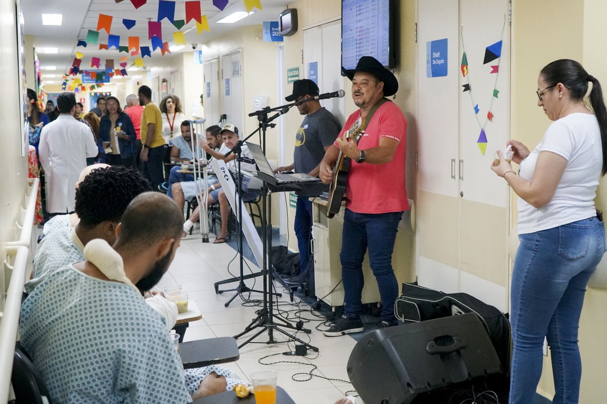 Na manhã desta terça-feira (25), o andar da internação da ortopedia do Hospital de Base do Distrito Federal (HBDF) se transformou em um verdadeiro arraial junino. Colaboradores e pacientes participaram de uma festa animada com música ao vivo, dança, comidas típicas e enfeites coloridos, resgatando a nostalgia das tradicionais festas juninas.