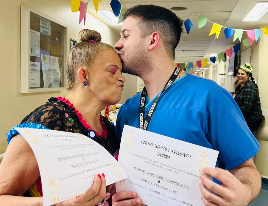 Conhecida por ser a noiva da tradicional quadrilha junina todos os anos, Neusinha leu um poema emocionante sobre a própria trajetória no hospital, destacando a importância de seu trabalho e o amor pela equipe. “Hoje é um dia especial para mim. Vinte e nove anos atrás, comecei a trabalhar aqui. Tenho o maior orgulho de fazer parte dessa equipe,” declarou Neusinha, visivelmente emocionada.