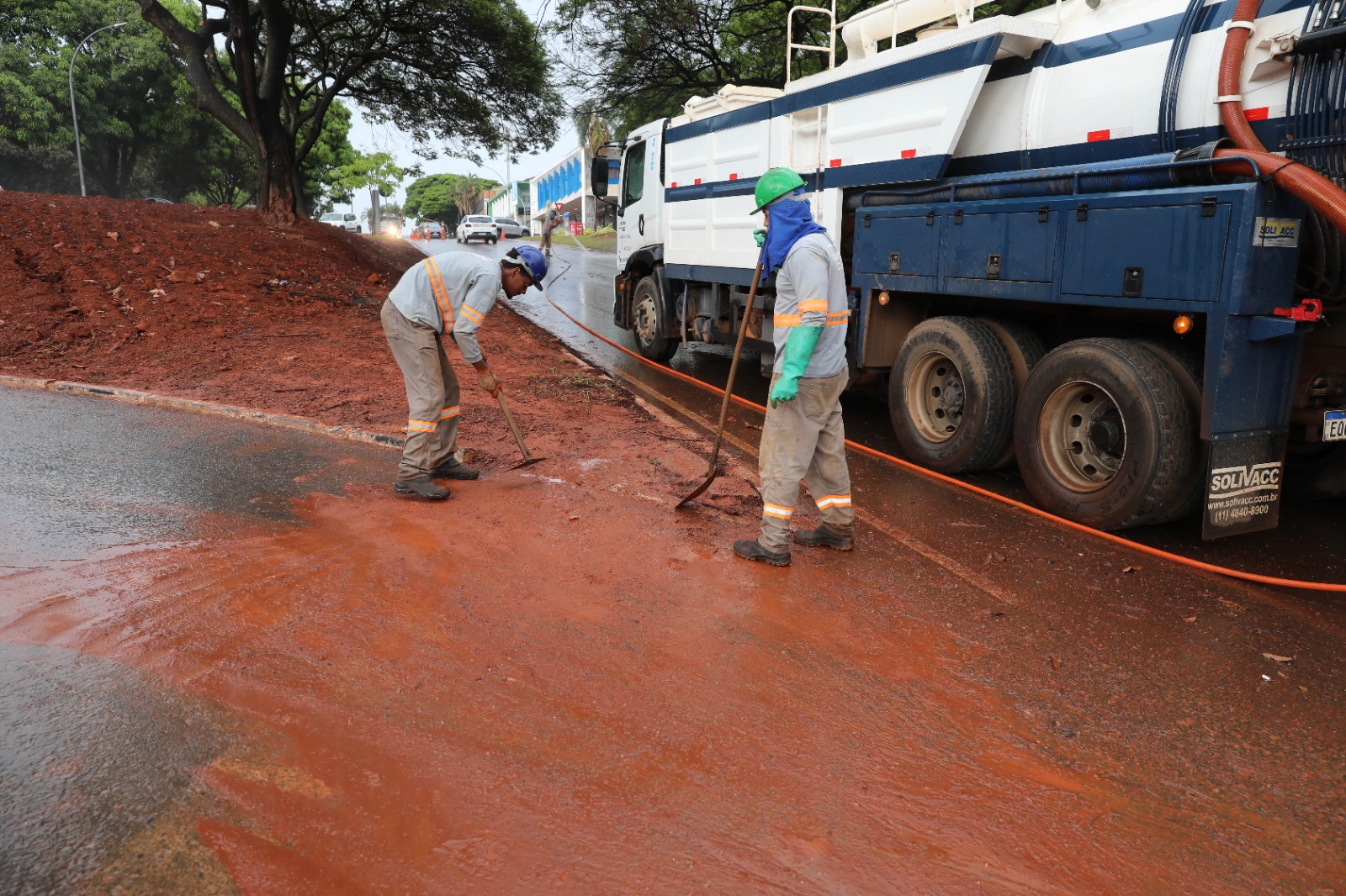 “A Novacap enviou os caminhões de sucção, que são caminhões hidrojato com capacidade de puxar tudo o que tem na boca de lobo, terra, lama… Ele está fazendo toda essa limpeza, retirando a terra, e nós estamos rastelando toda a grama para não descer mais nada”, explicou.