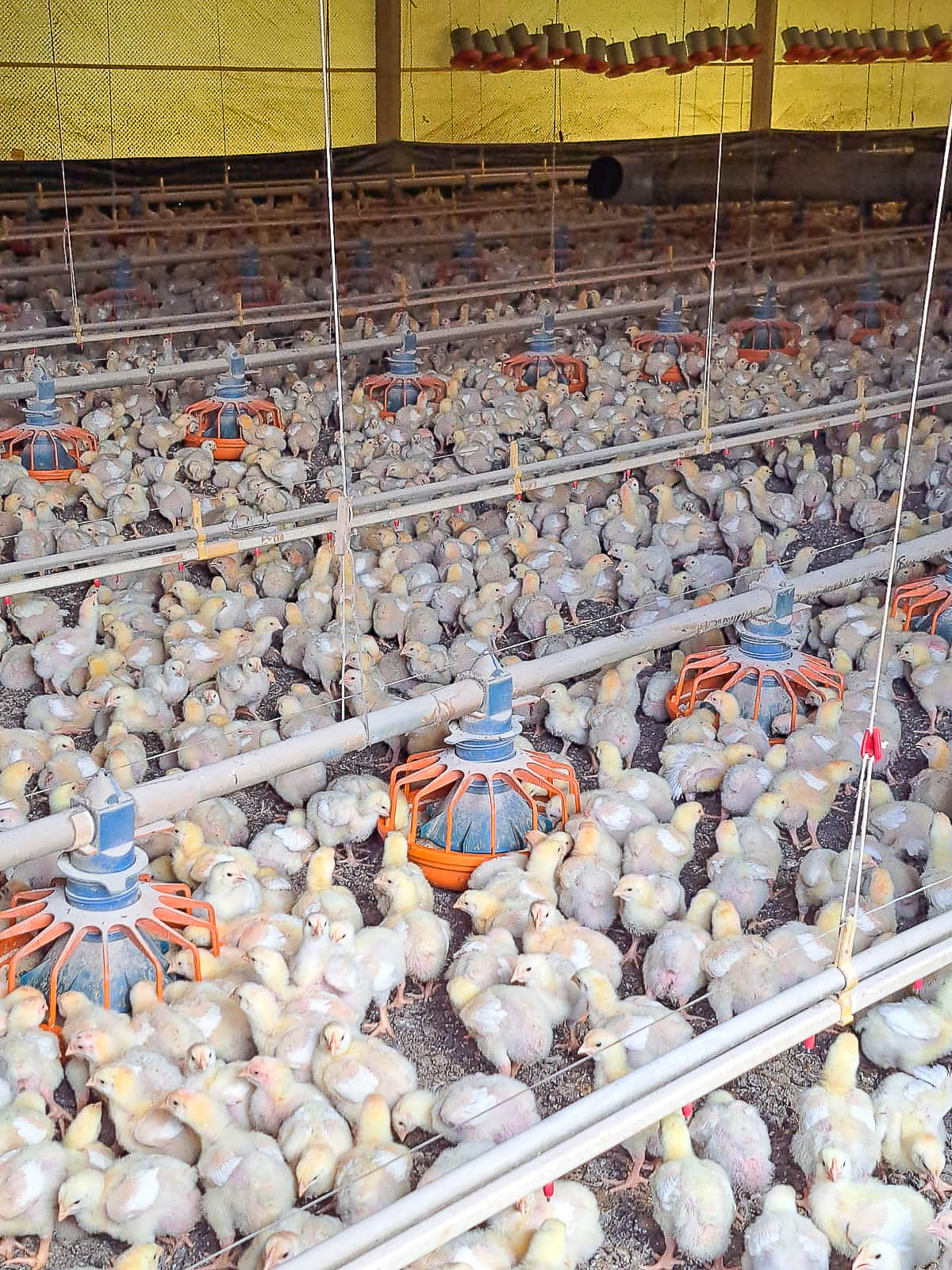 As aves chegam à propriedade com um dia de vida e são devolvidas às integradoras 41 dias depois. “O processo se inicia com o recebimento e o alojamento dos pintinhos e segue até a data da retirada pela empresa, quando os frangos atingem peso em torno de 3 kg”, explica Brasil, que é criterioso na preservação da segurança sanitária da criação. “Os cuidados são rigorosos para evitar a contaminação das aves por doenças, em especial a salmonela e a influenza aviária, o que inviabilizaria o consumo por humanos. É proibida a entrada de pessoas estranhas no interior da granja, e os veículos que entram na fazenda passam pelo arco de desinfecção, que pulveriza produtos químicos para desinfetar as superfícies”.