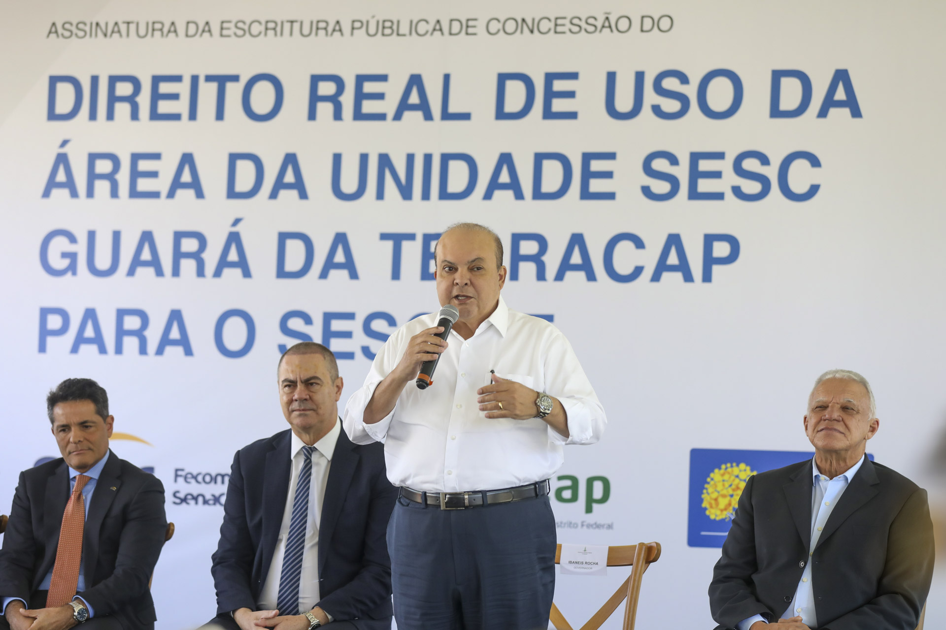 Durante a cerimônia, o governador Ibaneis Rocha enalteceu a parceria com a iniciativa privada e o que a entrega de escrituras representa para o Sesc e o governo como um todo.