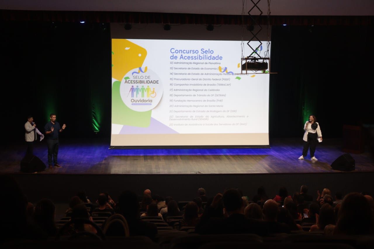 Na tarde desta terça-feira (12), o Teatro Caesb, em Águas Claras, foi palco de um marco na promoção da acessibilidade no Distrito Federal. A Controladoria-Geral do Distrito Federal (CGDF), em parceria com a Secretaria da Pessoa com Deficiência (SEPD-DF), realizou a cerimônia de entrega do Selo de Acessibilidade das Ouvidorias do GDF – 2024. O evento reconheceu 23 órgãos do governo que se destacaram por oferecer atendimento inclusivo e acessível às pessoas com deficiência, garantindo que suas demandas sejam ouvidas e resolvidas com respeito e eficiência. Na primeira edição 24 órgãos participaram espontaneamente e 99,9% deles pontuaram em todas as categorias.