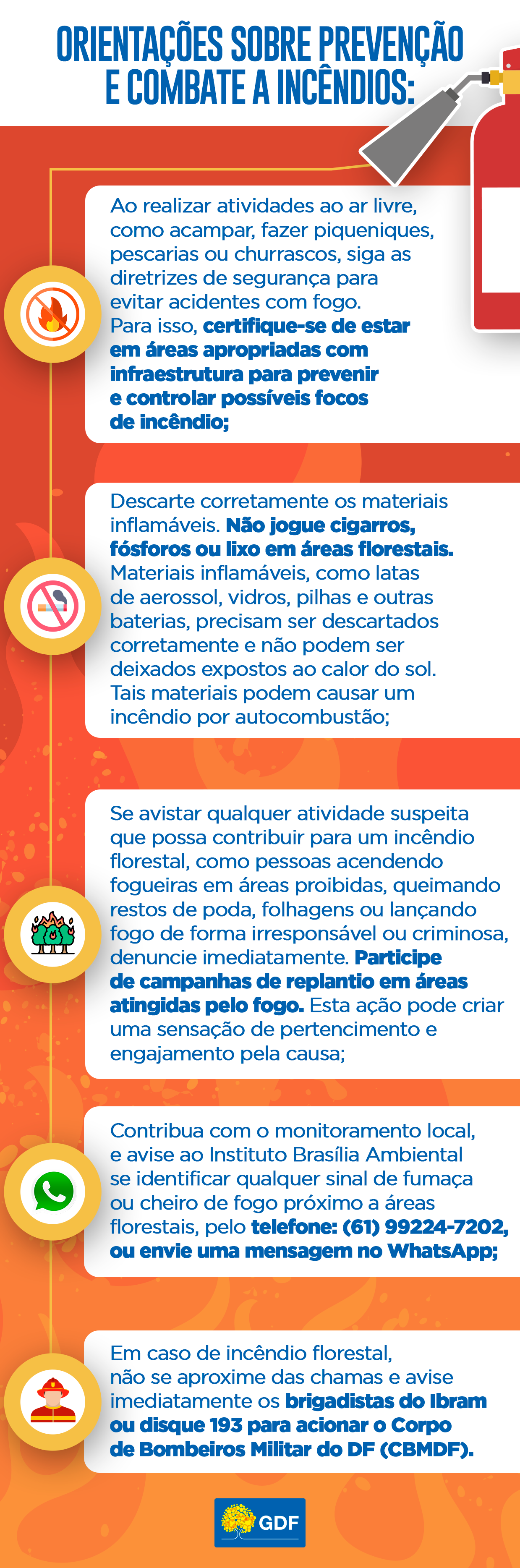 “Existe a possibilidade de aumento do número de queimadas neste ano e assim, consequentemente, o aumento também do número de chamadas ao Corpo de Bombeiros. É de suma importância que a população nos apoie tendo a consciência de não realizar queimadas sem o devido apoio do CBMDF, não colocando em risco nossa fauna e flora, nossas vidas e nossos bens patrimoniais”, reforça o coronel Sandro Gomes, Comandante-Geral do CBMDF.