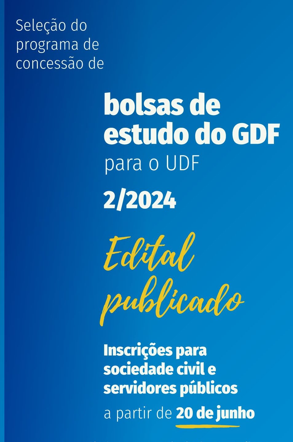 O Governo do Distrito Federal (GDF) lança, nesta terça-feira (11), o concurso semestral para seleção do programa de concessão de bolsas de estudo, para as vagas abertas no Centro de Ensino Unificado do DF (UDF), conforme Edital 1, publicado no Diário Oficial do Distrito Federal (DODF). Ao todo, são oferecidas 73 vagas destinadas aos servidores e empregados públicos do GDF e aos ex-alunos da rede pública de ensino.