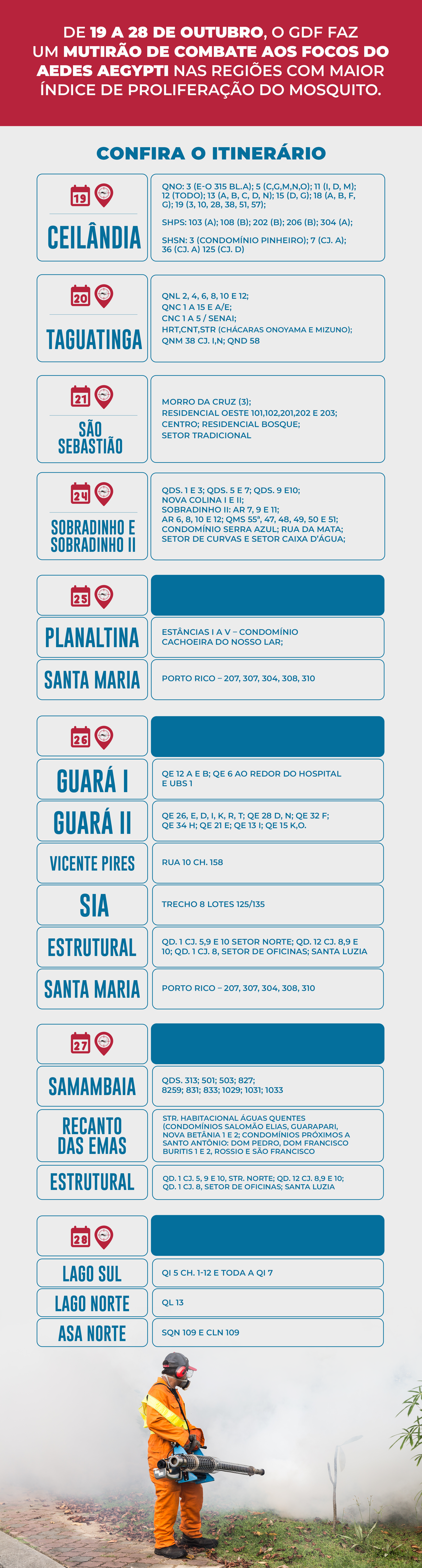 O mutirão vai passar por Ceilândia, Taguatinga, São Sebastião, Sobradinho, Planaltina, Santa Maria, Guará, Vicente Pires, SIA, Estrutural, Samambaia, Recanto das Emas, Lago Sul, Lago Norte e Asa Norte. Das 17h30 às 22h, dez carros-fumacê circularão ao mesmo tempo em uma determinada cidade, reforçando o trabalho combativo e preventivo da transmissão. Já na parte da manhã, as ações de rotina seguem isoladas em outros pontos das cidades.
