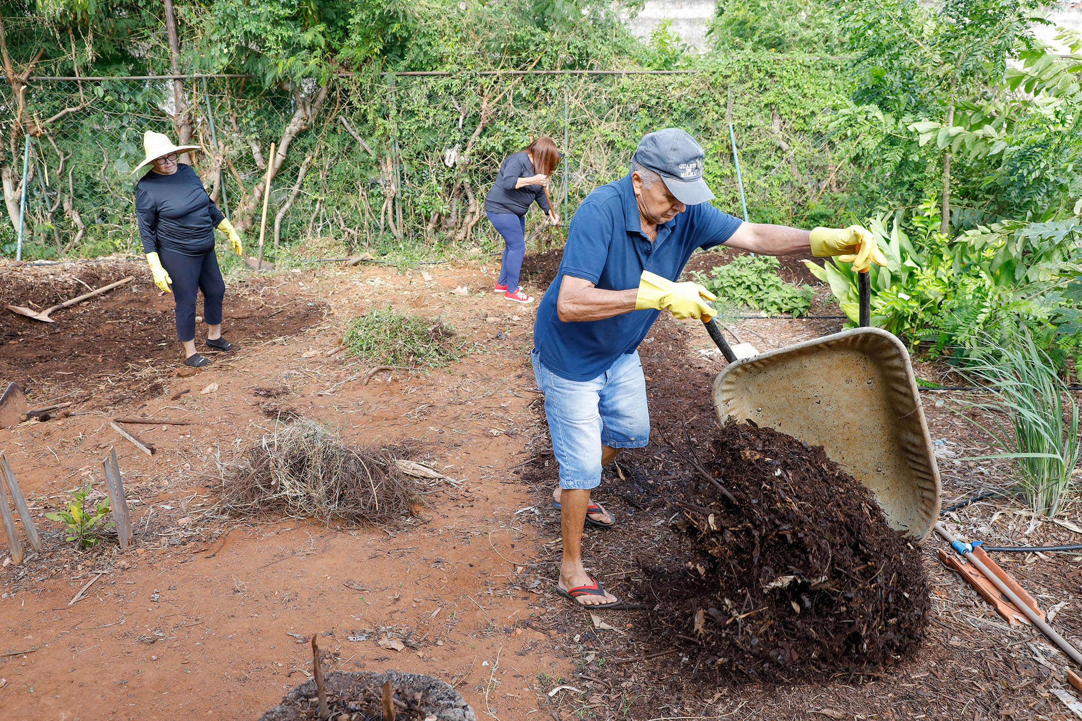 É o que aponta o aposentado Francisco Apolinário da Silva, um dos moradores de Ceilândia que, com 74 anos, cuida do cantinho da UBS 9 da cidade com dedicação e disposição, visíveis nas mãos que preparam a terra para o próximo plantio. “Eu chego, respiro um ar mais puro e tomo um banho de energia positiva. Essa é a parte que eu mais gosto no horto – quando eu entro ali, tenho um tempo comigo mesmo e parece que estou numa floresta. Antes eu tinha depressão. Hoje penso em coisas boas, tenho outra vida e uma vontade de viver cada dia mais. Me sinto mais entusiasmado e não pretendo parar por aqui”, relata.