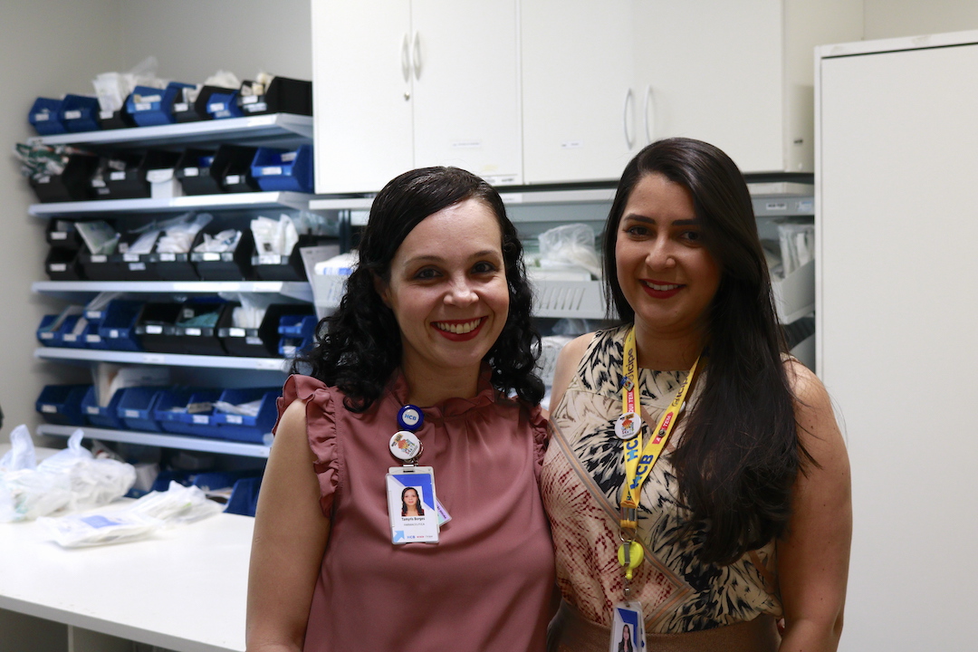 Kalina Ribeiro (D) com Tamyris Borges: “O NoHarm faz tudo automático e já fala se o paciente é de alto, médio ou baixo risco” | Foto: Divulgação/HCB