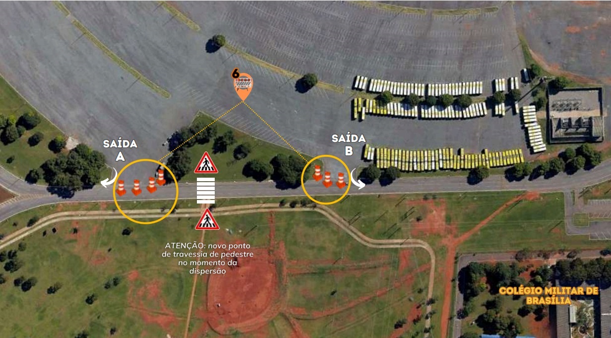 Durante a dispersão, a partir das 23h, na altura do estacionamento rotativo, os veículos da saída “A” serão direcionados para a via N1, já os veículos oriundos da saída “B” seguirão no sentido Colégio Militar. O Detran-DF implantará sinalização para canalizar o fluxo de veículos em sentido único, para isso a rotatória da Curva do Chinelo, próxima ao Complexo Aquático Cláudio Coutinho, ficará bloqueada.