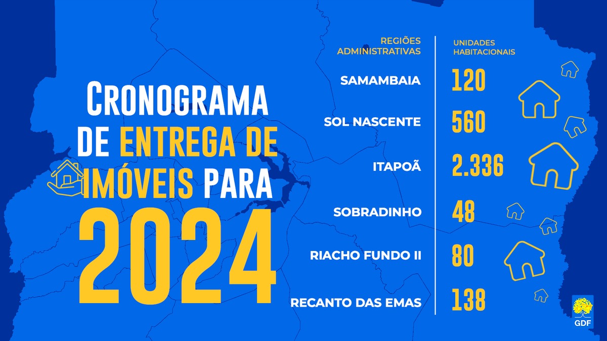 Para 2024, a previsão é de que sejam entregues 3.282 unidades habitacionais, distribuídas por Sol Nascente, Itapoã, Sobradinho, Samambaia e Riacho Fundo II, um investimento de mais de R$ 550 milhões por parte do GDF e do governo federal
