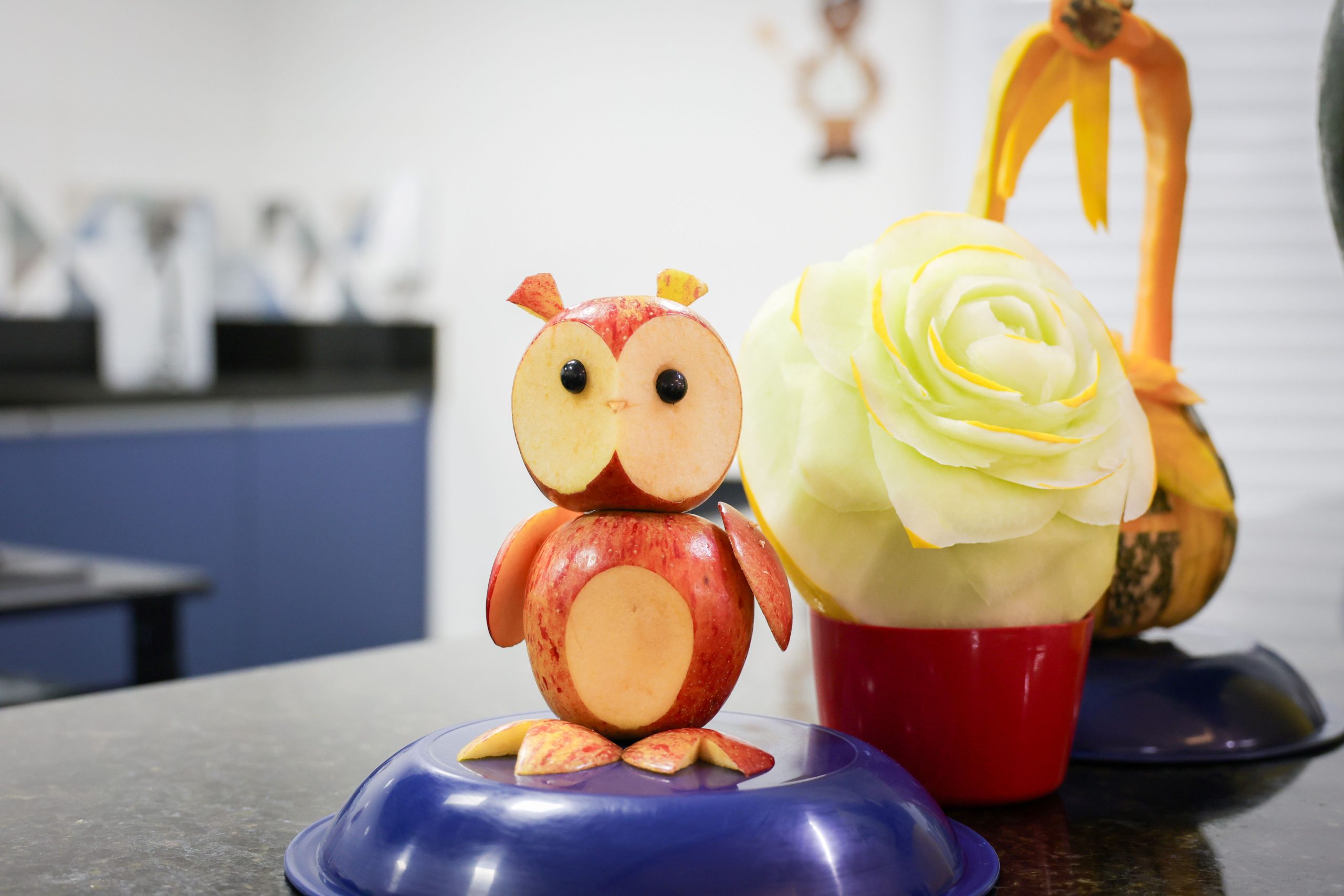 De figuras de animais até desenhos em melancias, Vanda apresenta um amplo repertório artístico ao oferecer a alimentação às crianças