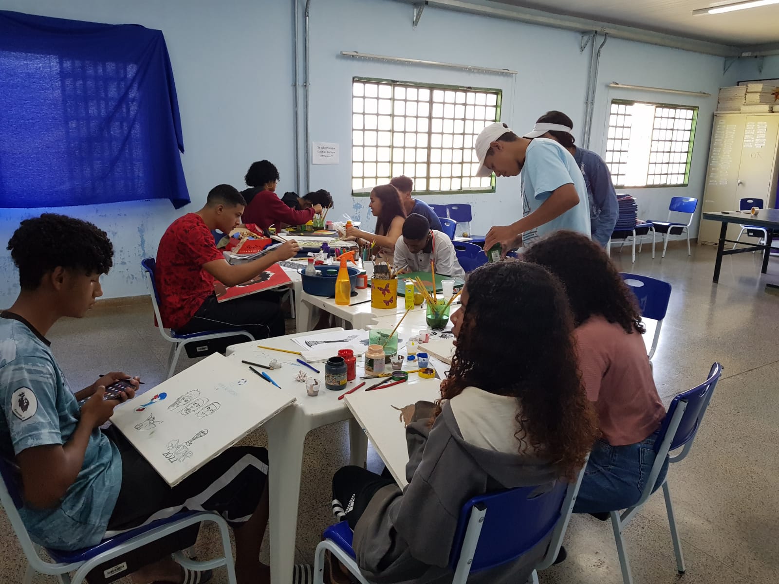 Os adolescentes fizeram pintura em tela ou cartolina, utilizando tintas, tecidos, sementes e papéis coloridos para a composição das imagens