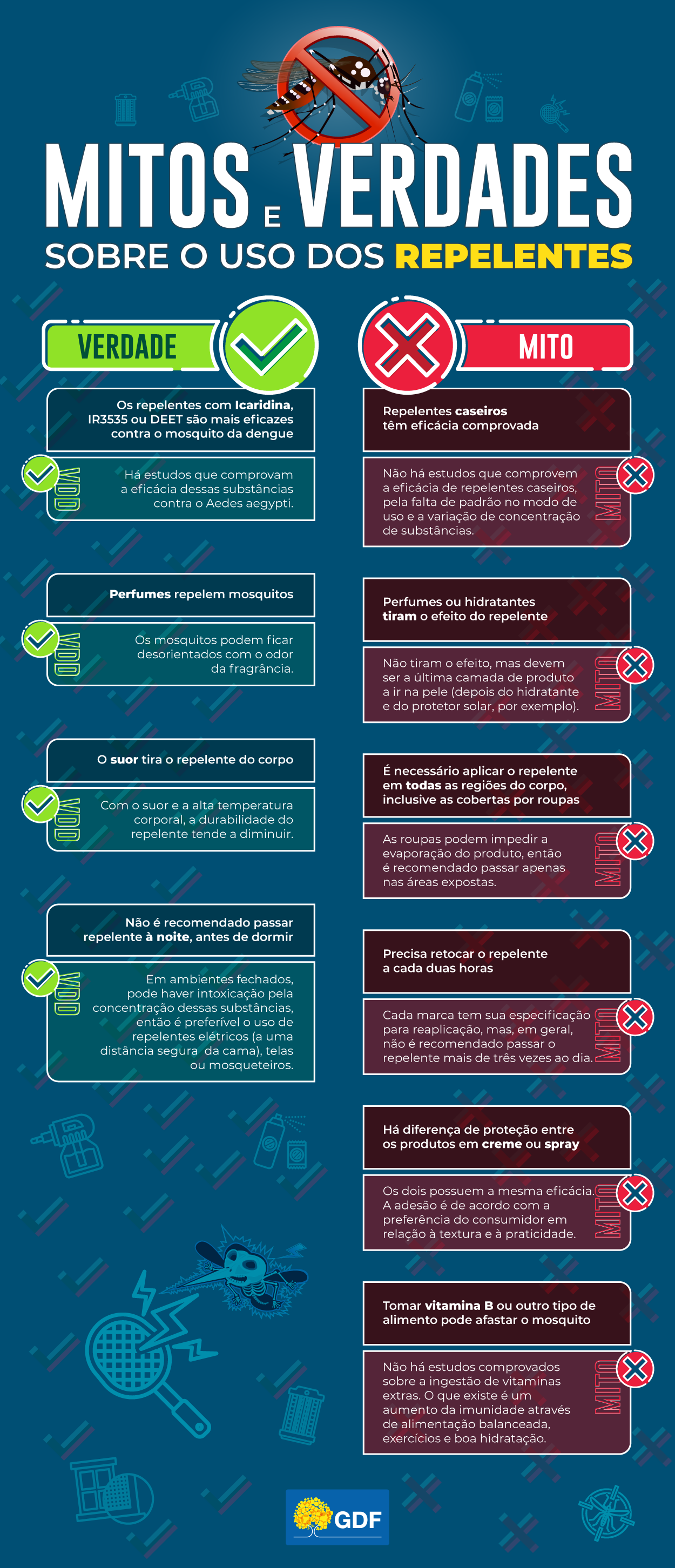 Para desvendar os mitos e verdades dos repelentes, é importante saber que eles agem entupindo os poros das antenas dos mosquitos, impedindo que eles sintam nosso odor e cheguem até a pele. Atualmente, três substâncias são permitidas e reguladas pela Anvisa para o uso nesses produtos de uso tópico (na pele): a icaridina, o IR3535 e o DEET. A diferença entre esses produtos é basicamente o tempo de duração e a recomendação de uso.