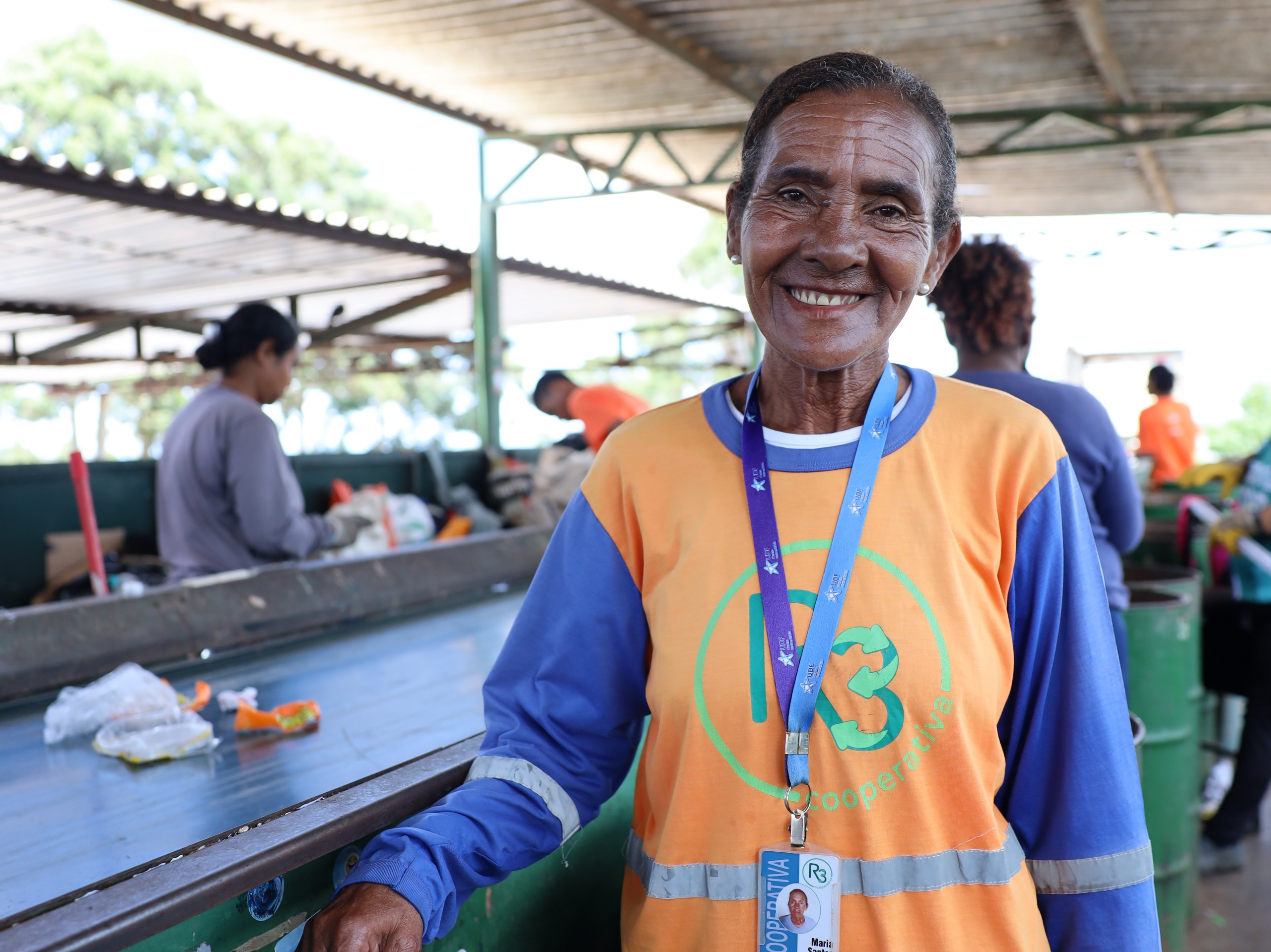 A trajetória de Maria foi marcada por dificuldades, mas também por sua persistência, conforme ela conta: “Quando vim para Brasília, vi que tinha muito material reciclável e pensei: ‘vou pra rua’. Trabalhei como diarista e catadora, consegui trazer meus filhos para cá e construir minha vida. Hoje, graças à cooperativa, tenho uma renda muito boa, posso me alimentar bem e me vestir bem. Eu evoluí, corri atrás com essa força de catadora e venci. Amo o que faço e tenho muito orgulho de estar aqui”.