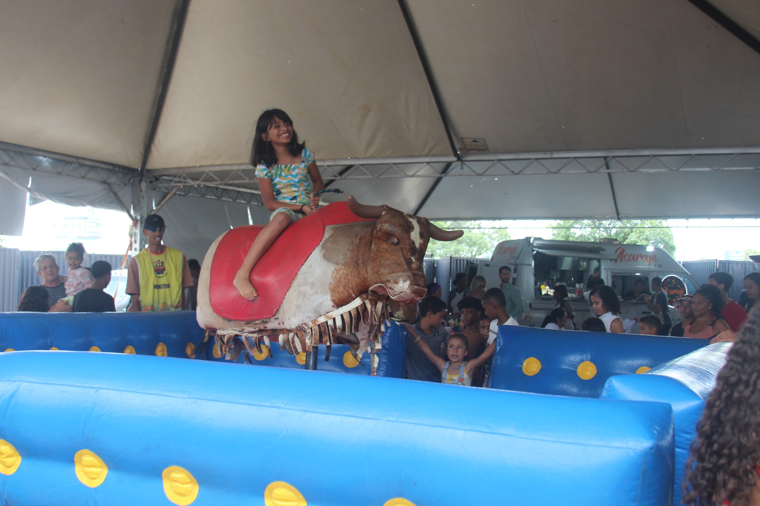 Menina se diverte no touro mecânico: para a criançada, sábado foi de muita alegria