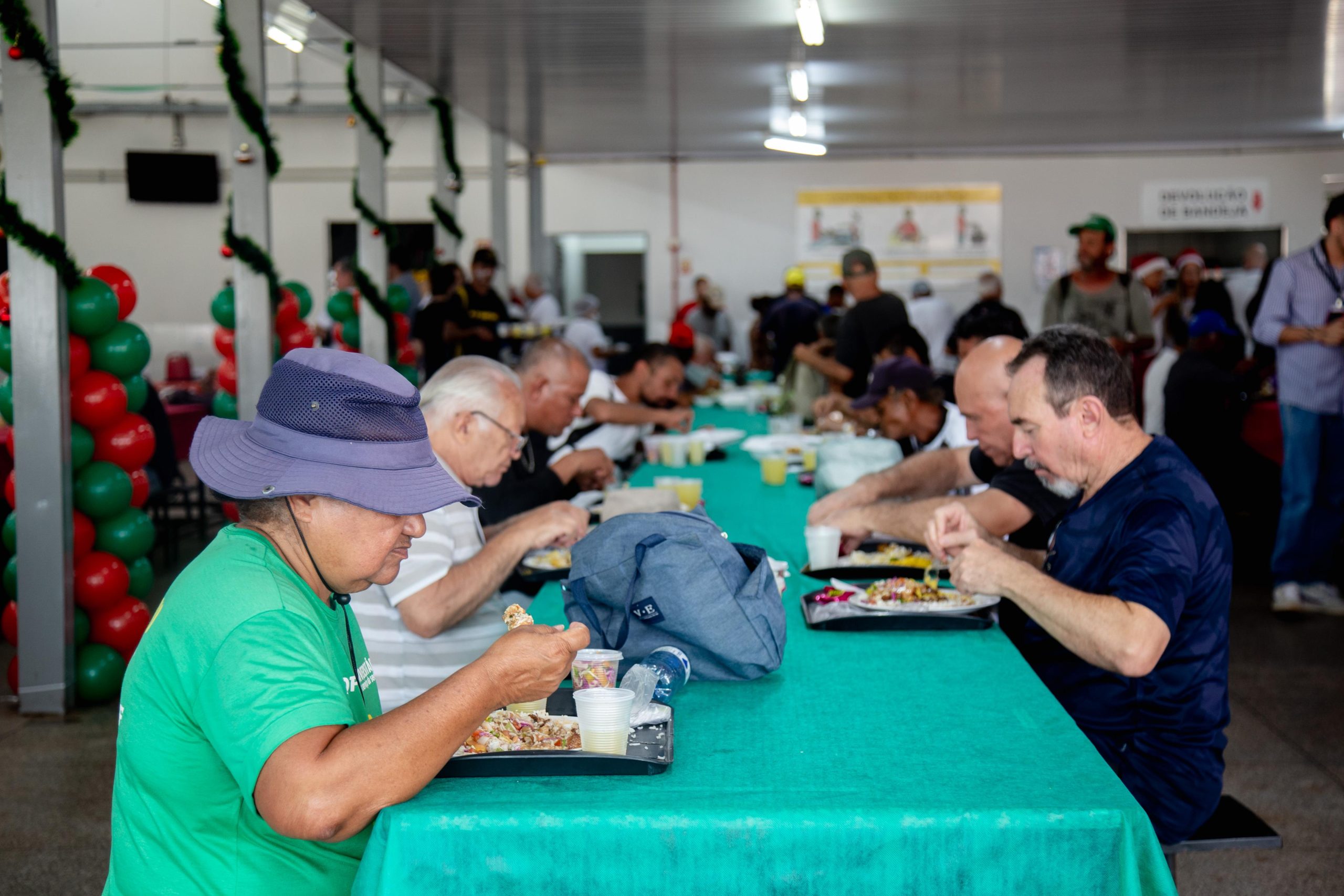 Nesta segunda (16), o restaurante comunitário de Santa Maria, além de bem decorado, caprichou na ceia natalina. O menu foi composto por pernil assado ao molho califórnia, coxa e sobrecoxa ao molho de ervas, farofa natalina e salada tropical. O cardápio teve direito até a bombom de sobremesa e suco de abacaxi com hortelã para acompanhar.