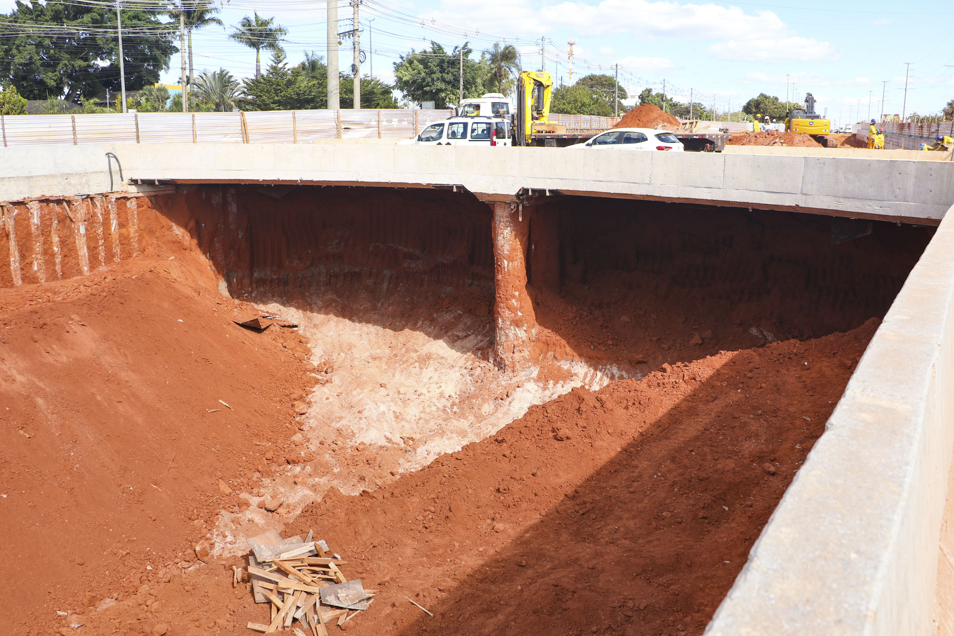 As obras do Complexo Viário do Jardim Botânico, na altura do km 27,2 da DF-001, estão em ritmo acelerado. Por trás dos tapumes, colocados para garantir a segurança da população durante a execução do projeto, estruturas de contenção estão sendo colocadas nas áreas escavadas. Paralelamente a isso, nos pontos mais avançados está sendo feita a projeção do concreto. O investimento do Governo do Distrito Federal (GDF) na obra é de R$ 33,5 milhões.