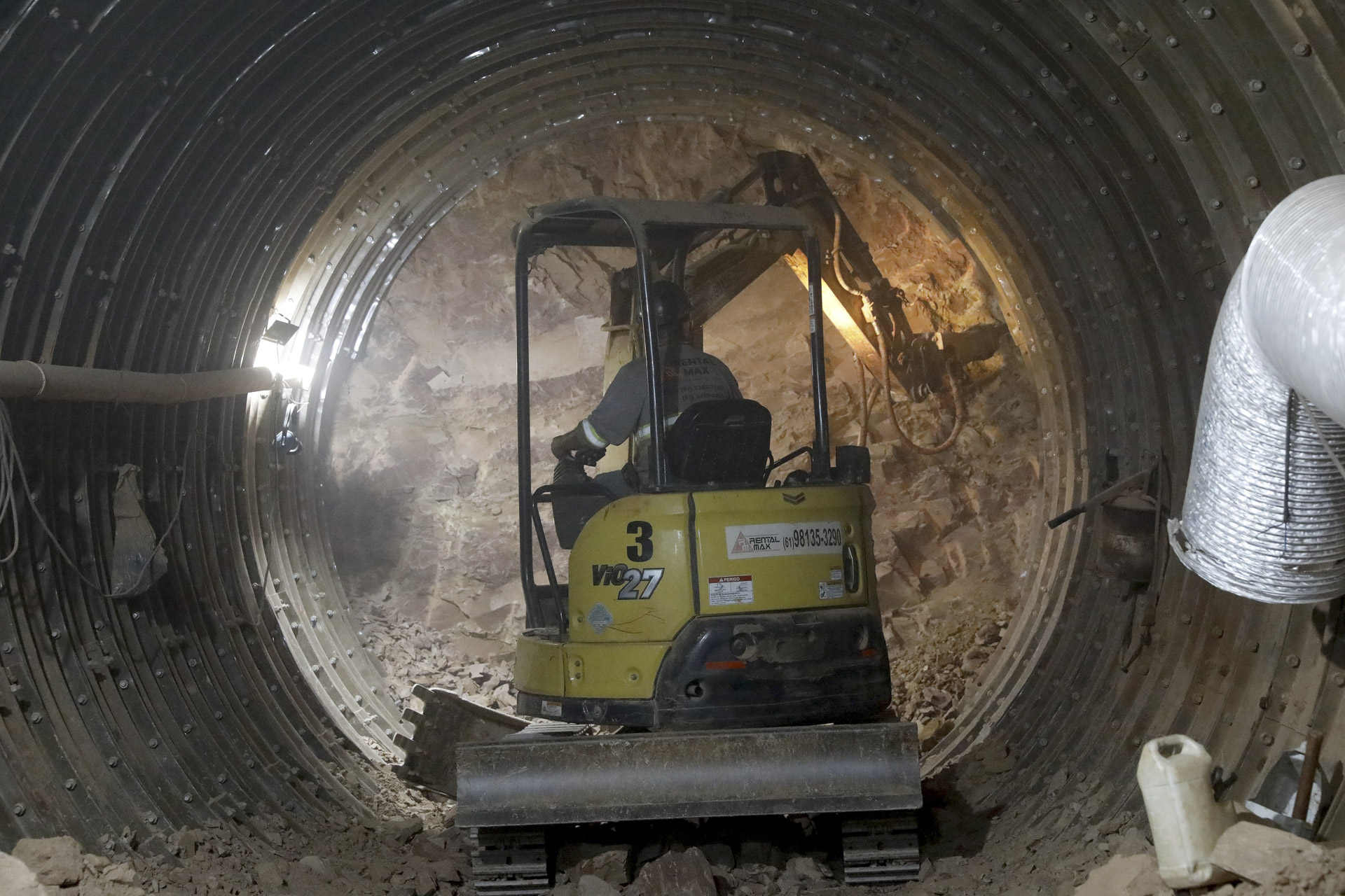 Diante do obstáculo, foram montadas sete frentes de trabalho e, em todas elas, a alternativa foi recorrer ao uso de escavadeiras e furadeiras hidráulicas – equipamentos especializados munidos de brocas capazes de perfurar e romper solos resistentes. E foi preciso montar uma verdadeira operação para viabilizar a utilização dos aparatos no interior do túnel.
