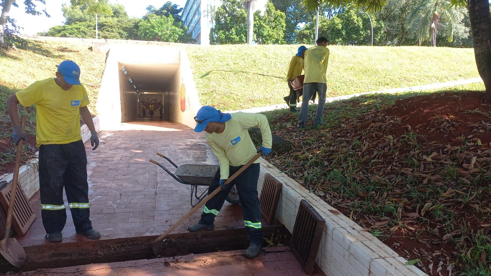 Depois do temporal que atingiu Brasília na madrugada desta sexta (14), as canaletas da passagem subterrânea da 105 Sul passaram por limpeza | Foto: Divulgação/Administração do Plano Piloto