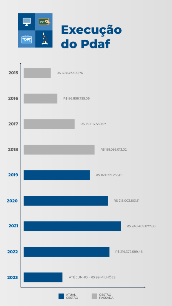 No primeiro semestre deste ano, a Secretaria de Educação (SEEDF) descentralizou R$ 54 milhões do Pdaf ordinário e R$ 45 milhões de emendas parlamentares. O dinheiro foi repassado às escolas por meio de portarias publicadas entre janeiro e julho no Diário Oficial do Distrito Federal (DODF).