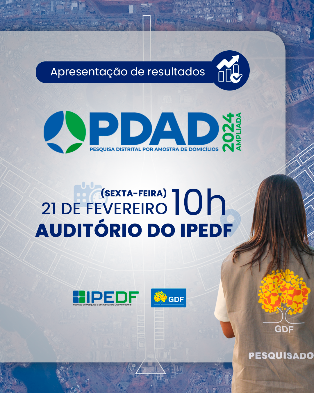 O Instituto de Pesquisa e Estatística do Distrito Federal (IPEDF) apresenta os resultados da nova Pesquisa Distrital por Amostra de Domicílios Ampliada (Pdad-A) 2024. Pela primeira vez, o levantamento traz dados detalhados de domicílios localizados nas áreas urbanas e rurais das 35 regiões administrativas do Distrito Federal, além dos 12 municípios que compõem a Periferia Metropolitana de Brasília (PMB).