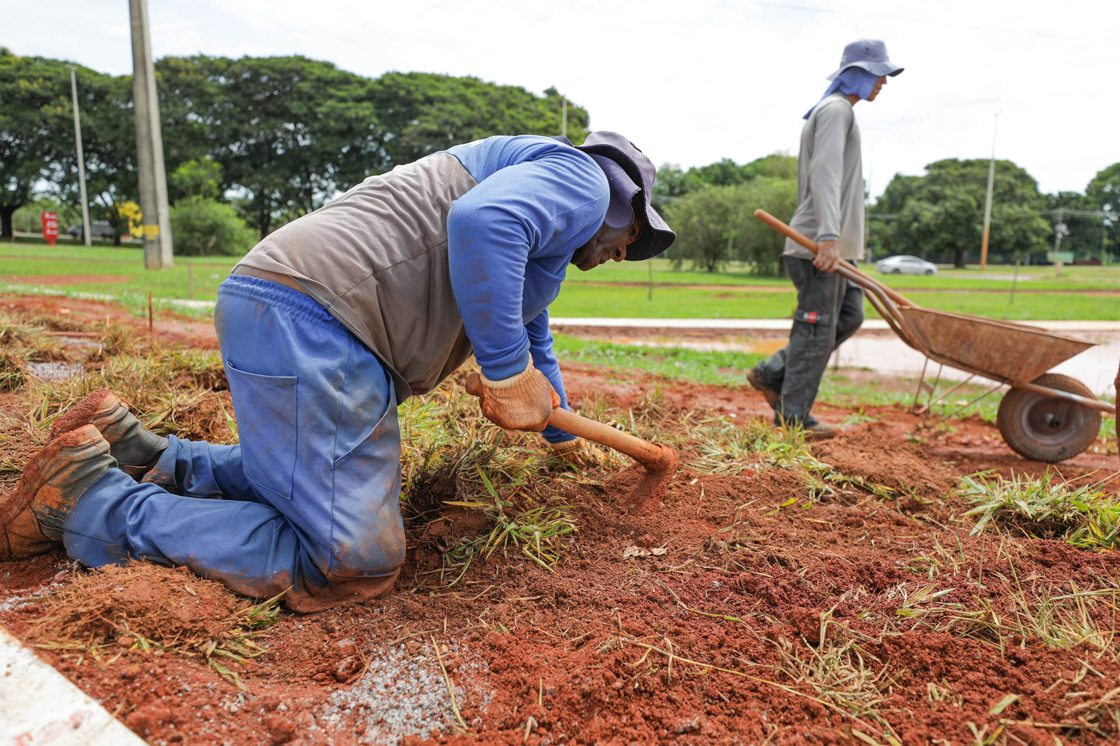 O plantio de mais de 2 mil metros de grama natural ao redor da bacia de detenção do Drenar DF começou nesta semana | Foto: Tony Oliveira/Agência Brasília