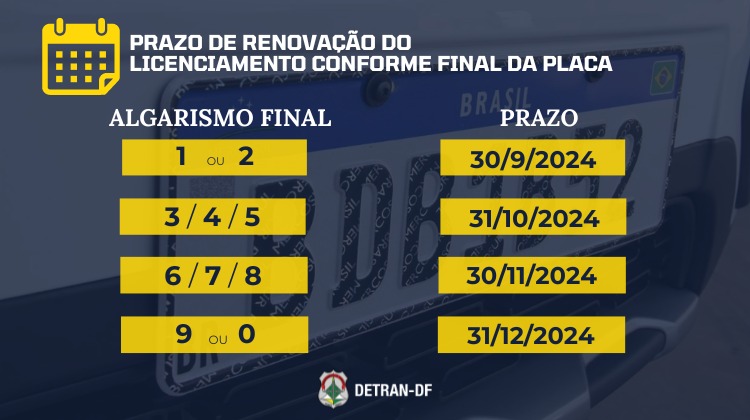 De acordo com a norma, veículos com placa final 1 e 2 têm até dia 30 deste mês para realizar a renovação do licenciamento referente a 2024. A partir de 1° de outubro, para a circulação desses veículos, será necessário o Certificado de Registro e Licenciamento de Veículo em meio digital (CRLV-e) 2024. Veículos com placa terminada em 3, 4 e 5 devem ser licenciados até 31 de outubro; até 30 de novembro para os de final 6, 7 e 8; e até 31 de dezembro, os de final 9 e 0.