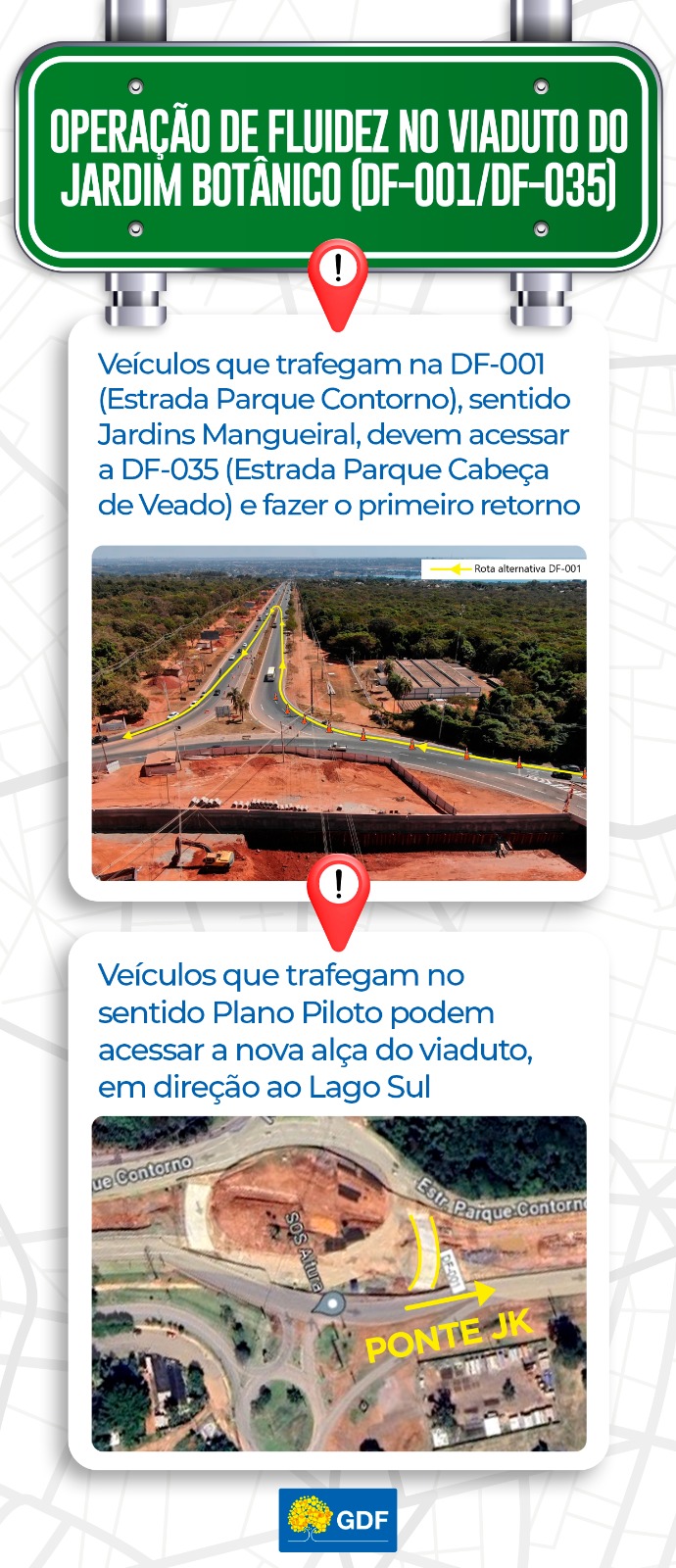 O Governo do Distrito Federal (GDF) liberou, neste sábado (10), o primeiro trecho do viaduto do Jardim Botânico. Com isso, os motoristas que vão do Jardins Mangueiral pela Estrada Parque Contorno (DF-001) e quiserem acessar o Lago Sul pela Estrada Parque Cabeça de Veado (DF-035) podem utilizar a alça do balão aberta neste sábado.